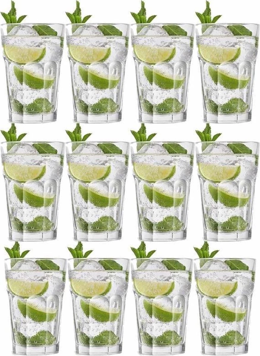 Materiaal: glas. Formaat: Doorsnede glas: 9 cm. Hoogte glas: 13,5 cm. U ontvangt 12 glazen in totaal. Drinkglazen voor bijvoorbeeld water/frisdrankglazen.