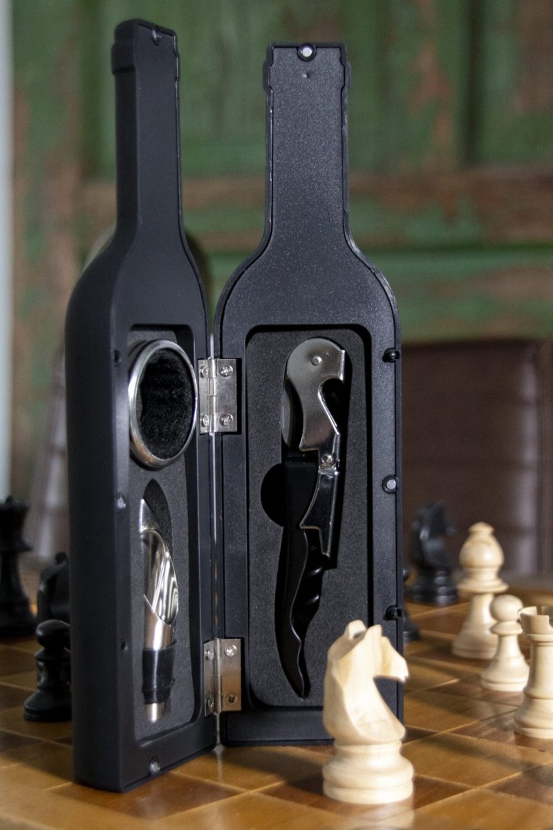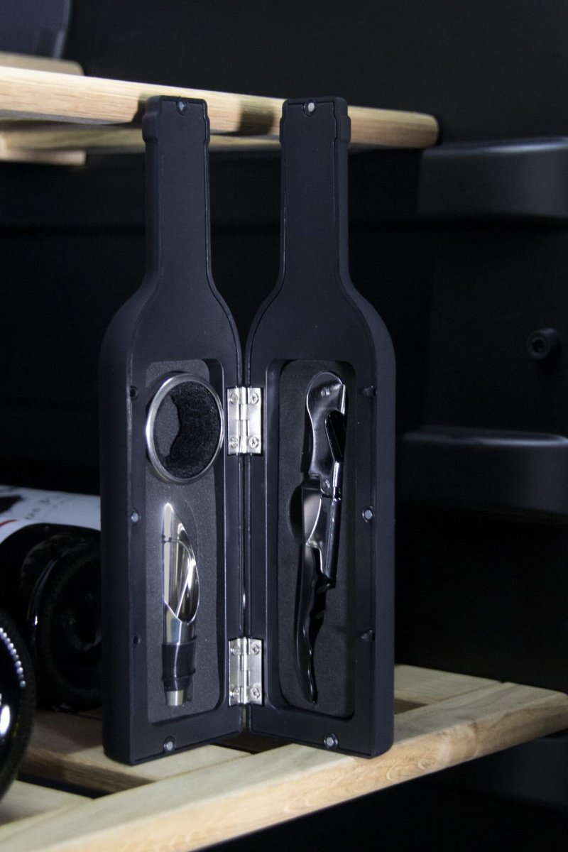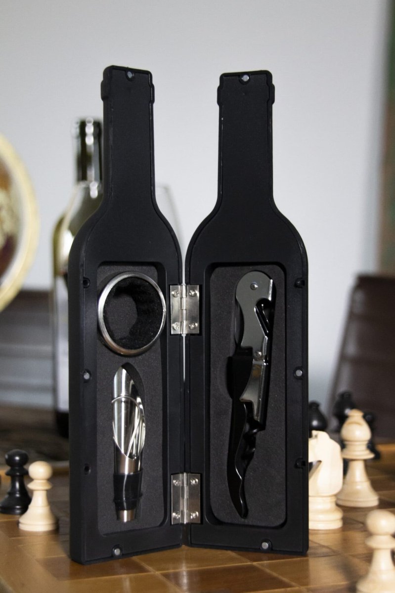 - Inhoud: kurkentrekker, wijnstopper, anti-druip ring en schenktuit.