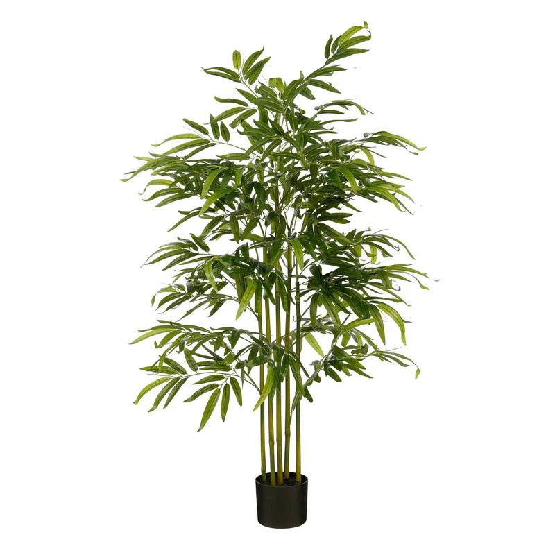 Breng wat onderhoudsvrij groen in huis met deze bamboe-kunstplant van Mica Decorations! De Bamboe, die vaak associeerd wordt met geluk, flexibiliteit en veerkracht, staat bekend om de smalle, lancetvormige bladeren met dunne, rechtopstaande stengels. Hij is gemaakt voor binnen én buiten, want hij is waterproof en UV-resistant. Je kunt hem hierdoor seizoen na seizoen buiten laten staan. Hij heeft een hoogte van ongeveer 150 cm en een diameter van 60 cm en de plant wordt geleverd in een zwarte kunststof pot van H12,5 x Ø15 cm.