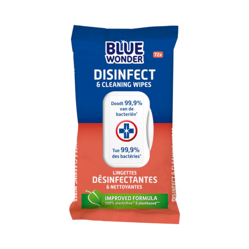 De Blue Wonder gebruiksklare grote reinigingsdoeken reinigen en desinfecteren in één. De vochtige doeken zijn gemakkelijk uit de hersluitbare verpakking te halen met als doel harde oppervlakken te kunnen reinigen én bacterievrij te maken.