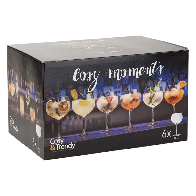 Voor een gezellige cocktail avond mag een Gin Tonic natuurlijk niet ontbreken. En die Gin Tonic schenk je in deze prachtige Gin Tonic glazen van Cosy Moments. Deze set bevat 6 Gin Tonic glazen, ieder glas heeft een inhoud van 700 ml (70cl). De complete set wordt geleverd in een stevige doos. De glazen zijn gemaakt van dikker glas zodat het glas niet breekt door de ijsklontjes of door het roeren met een cocktail lepel. De glazen zijn vaatwasserbestendig. Kortom, de perfecte glazen om jouw gasten te trakteren op een heerlijke Gin Tonic.