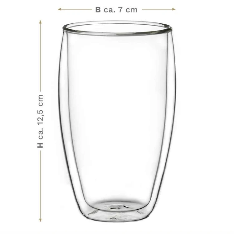 Start je dag goed met een kop koffie in de Creano dubbelwandige koffieglazen 250ml. Deze dubbelwandige glazen hebben een smalle en hoge vorm en worden geleverd in een set van 4 glazen. Naast koffie of een cappuccino zijn deze dubbelwandige glazen ook geschikt voor thee of frisdrank. De mondbeglazen dubbelwandige glazen van Creano zijn gemaakt van hittebestendig borosilicaatglas en kunnen zowel in de vaatwasser als in de magnetron. De glazen hebben een inhoud van 250ml, precies genoeg voor kop koffie (lungo) of cappuccino.