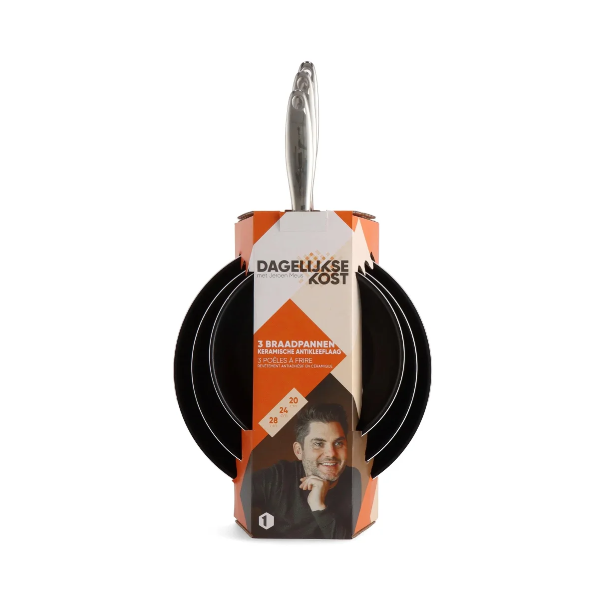 De aluminium pannen van Dagelijkse Kost hebben een keramische antiaanbaklaag die gemaakt is op basis van zand en nooit schadelijke stoffen of dampen zal vrijgeven, al raakt je pan per ongeluk oververhit. De coating geleidt de warmte snel en gelijkmatig, is zonder moeite schoon te maken en mag ook in de vaatwas, en zorgt voor een perfect korstje op je vlees of vis. De pannen hebben een ovenvaste greep in roestvrijstaal, kunnen op alle vuren inclusief inductie en zijn ovenvast tot 220°C. Echte allrounders dus, precies het soort pannen waarmee Jeroen Meus graag kookt. En het oog wil ook wat: deze collectie heeft een donker olijfgroene kleur en staat prachtig in elke keuken.