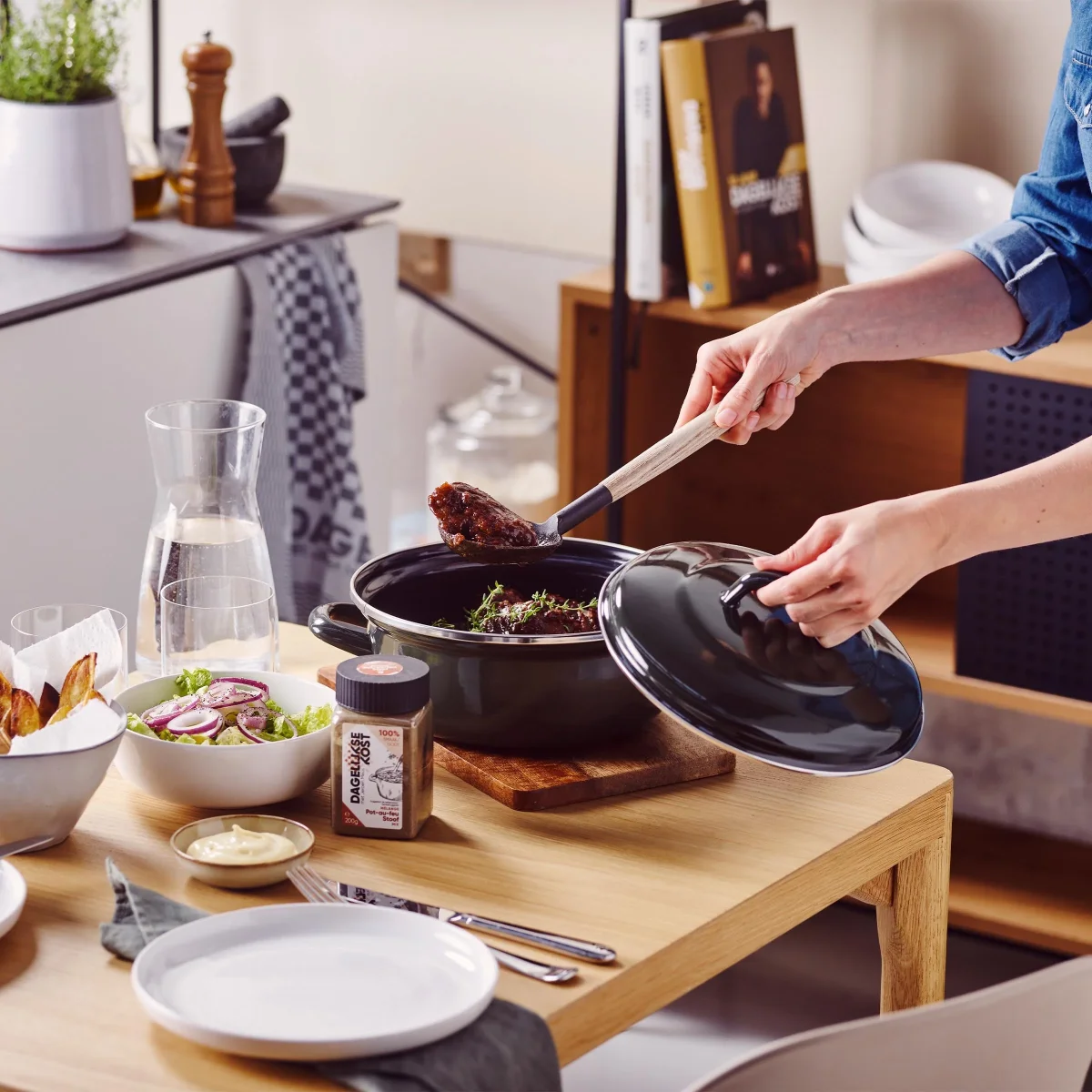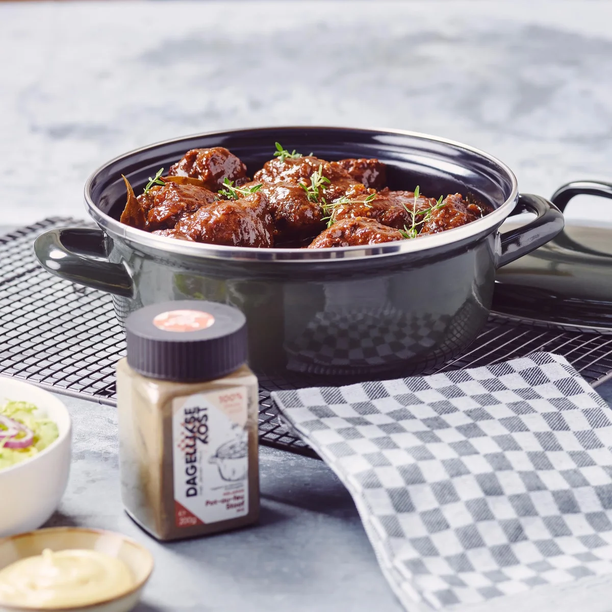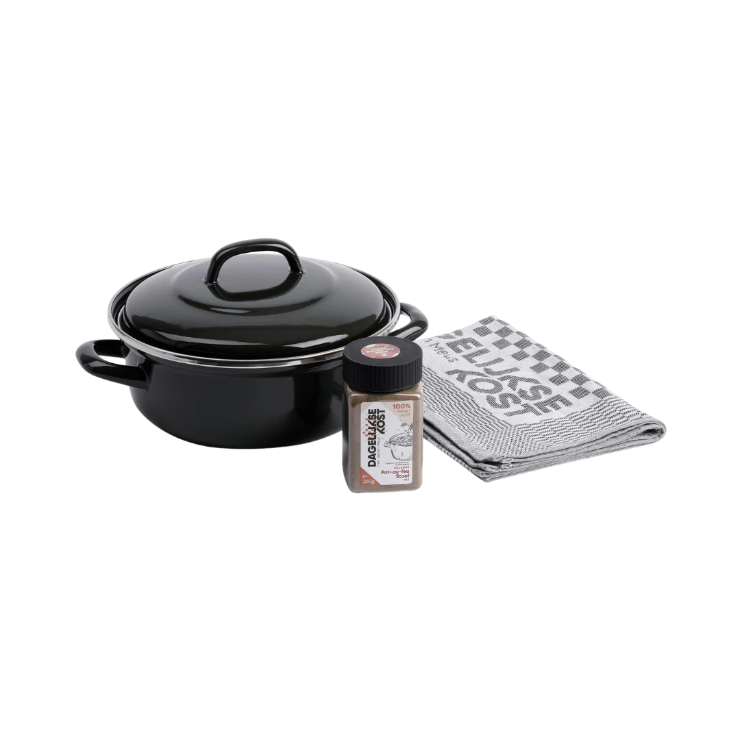 Deze mooie geschenkdoos bevat de Dagelijkse kost-stoofpot, het stoofvleesrecept van Jeroen Meus, een handige keukenhanddoek en een speciale kruidenmix. Met dit pakket haal je alles in huis om die Vlaamse klassieker bij uitstek klaar te maken: stoofvlees met frietjes. Nu nog de juiste ingrediënten… en voor je het weet staat er een dampende pot stoofvlees op tafel. Eet smakelijk!