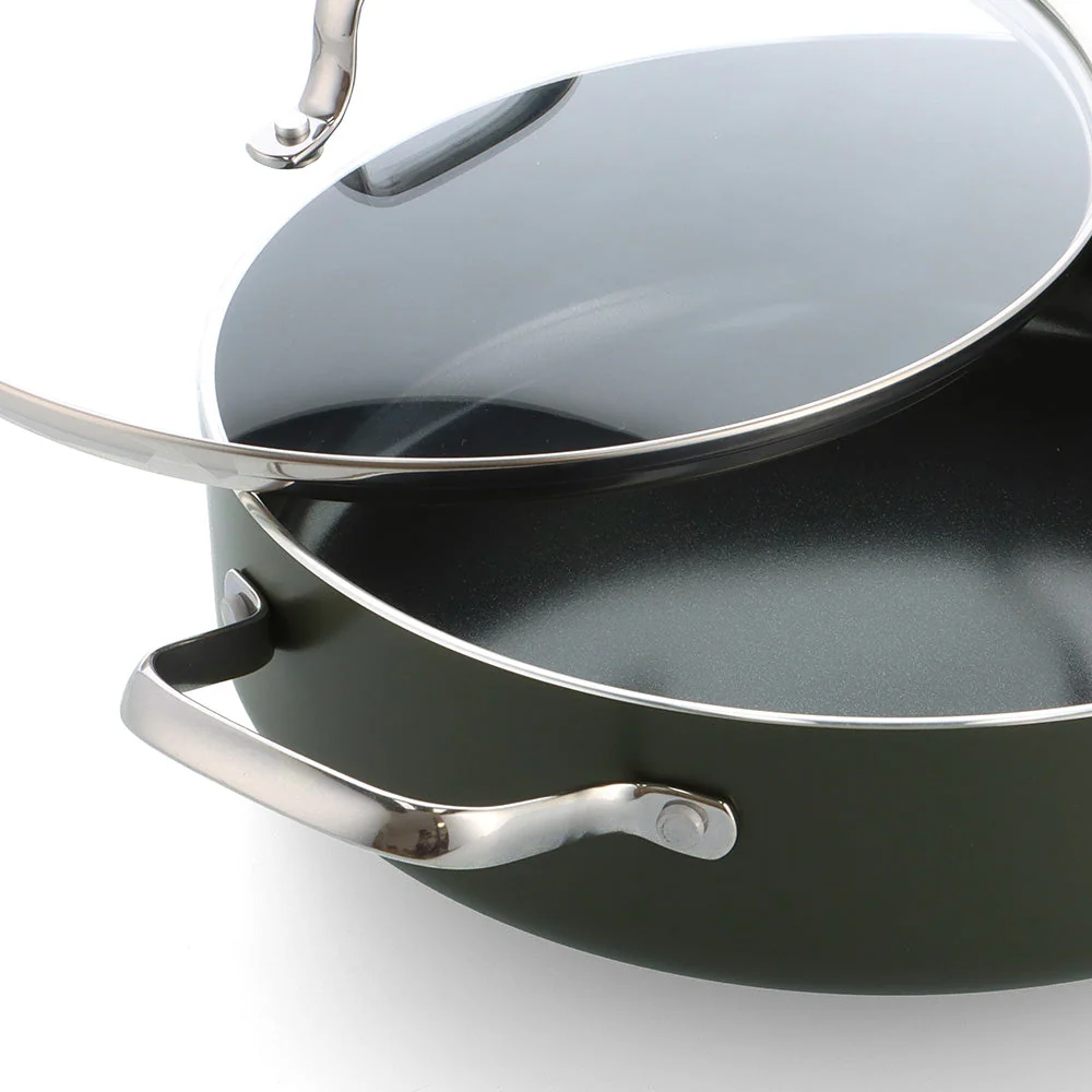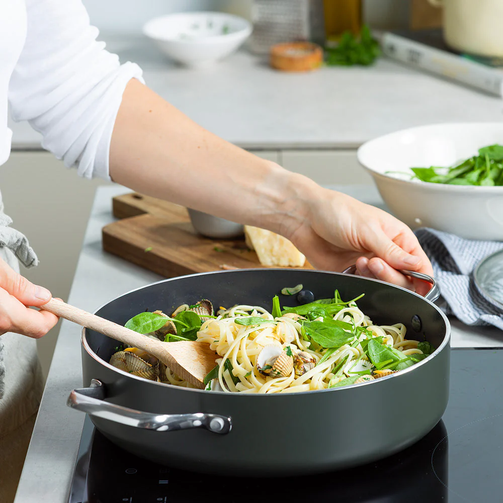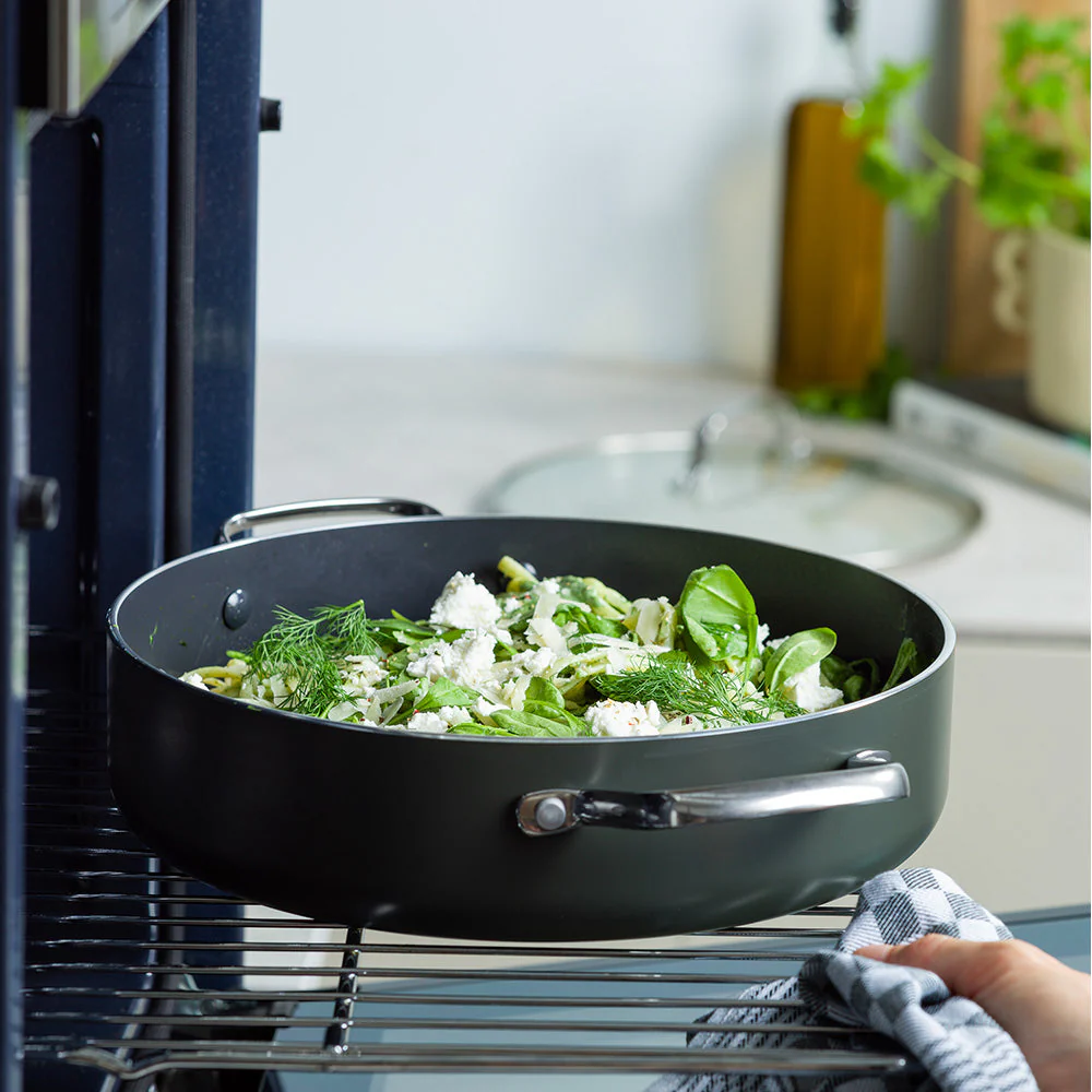 De aluminium pannen van Dagelijkse Kost hebben een keramische antiaanbaklaag die gemaakt is op basis van zand en nooit schadelijke stoffen of dampen zal vrijgeven, al raakt je pan per ongeluk oververhit. De coating geleidt de warmte snel en gelijkmatig, is zonder moeite schoon te maken en mag ook in de vaatwas, en zorgt voor een perfect korstje op je vlees of vis. De pannen hebben een ovenvaste greep in roestvrijstaal, kunnen op alle vuren inclusief inductie en zijn ovenvast tot 220°C. Echte allrounders dus, precies het soort pannen waarmee Jeroen Meus graag kookt. En het oog wil ook wat: deze collectie heeft een donker olijfgroene kleur en staat prachtig in elke keuken.