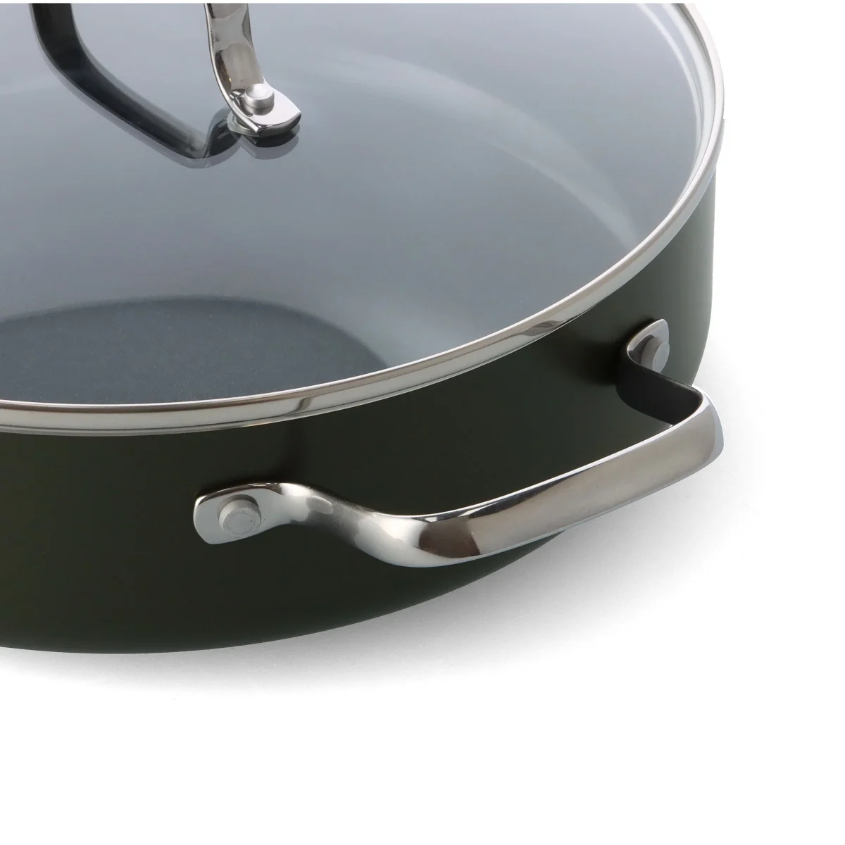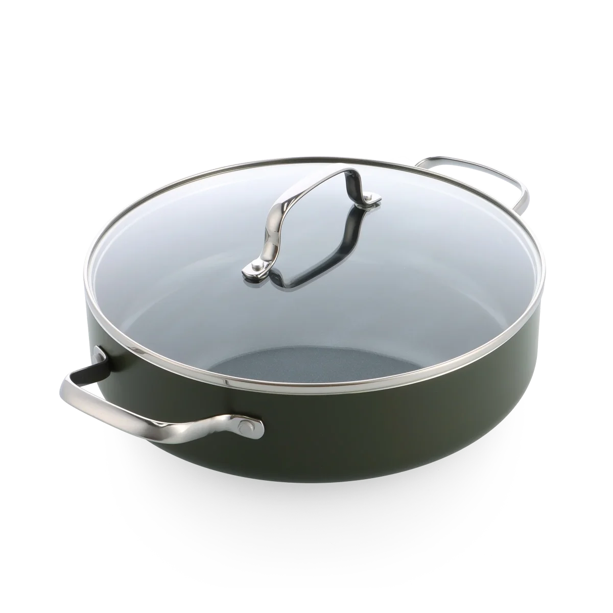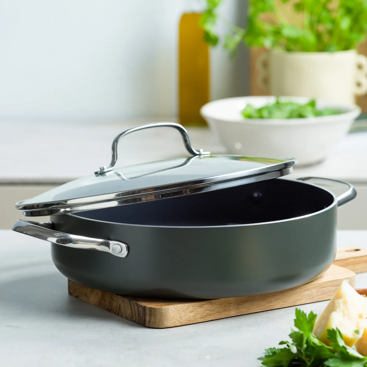 De aluminium pannen van Dagelijkse Kost hebben een keramische antiaanbaklaag die gemaakt is op basis van zand en nooit schadelijke stoffen of dampen zal vrijgeven, al raakt je pan per ongeluk oververhit. De coating geleidt de warmte snel en gelijkmatig, is zonder moeite schoon te maken en mag ook in de vaatwas, en zorgt voor een perfect korstje op je vlees of vis. De pannen hebben een ovenvaste greep in roestvrijstaal, kunnen op alle vuren inclusief inductie en zijn ovenvast tot 220°C. Echte allrounders dus, precies het soort pannen waarmee Jeroen Meus graag kookt. En het oog wil ook wat: deze collectie heeft een donker olijfgroene kleur en staat prachtig in elke keuken.