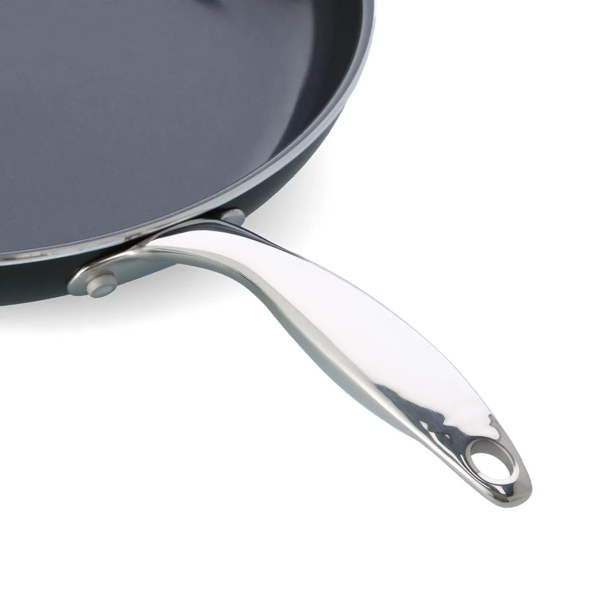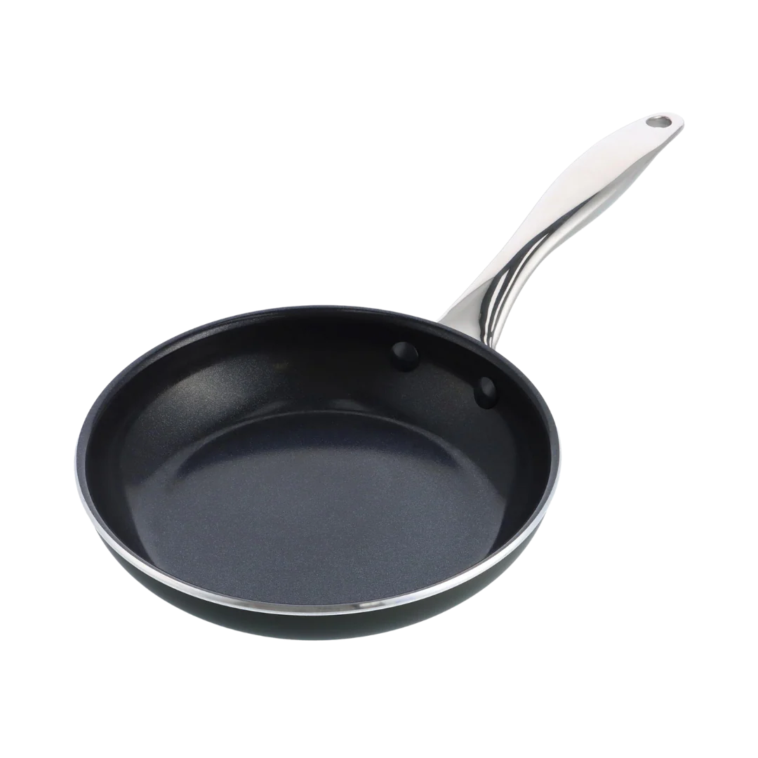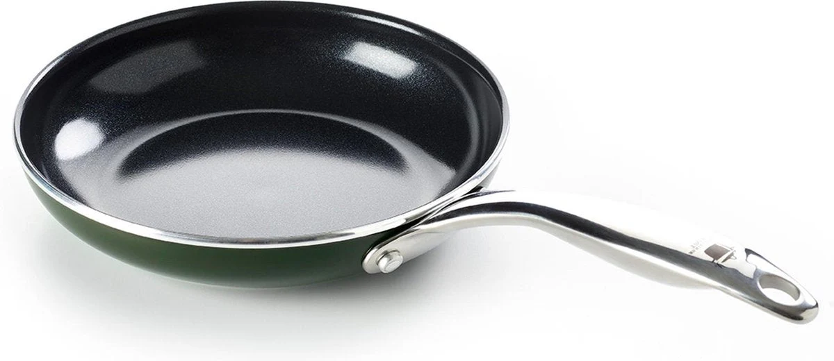 De aluminium pannen van Dagelijkse Kost hebben een keramische antiaanbaklaag die gemaakt is op basis van zand en nooit schadelijke stoffen of dampen zal vrijgeven, al raakt je pan per ongeluk oververhit. De coating geleidt de warmte snel en gelijkmatig, is zonder moeite schoon te maken en mag ook in de vaatwas, en zorgt voor een perfect korstje op je vlees of vis. De pannen hebben een ovenvaste greep in roestvrijstaal, kunnen op alle vuren inclusief inductie en zijn ovenvast tot 220°C. Echte allrounders dus, precies het soort pannen waarmee Jeroen Meus graag kookt. En het oog wil ook wat: deze collectie heeft een donker olijfgroene kleur en staat prachtig in elke keuken.