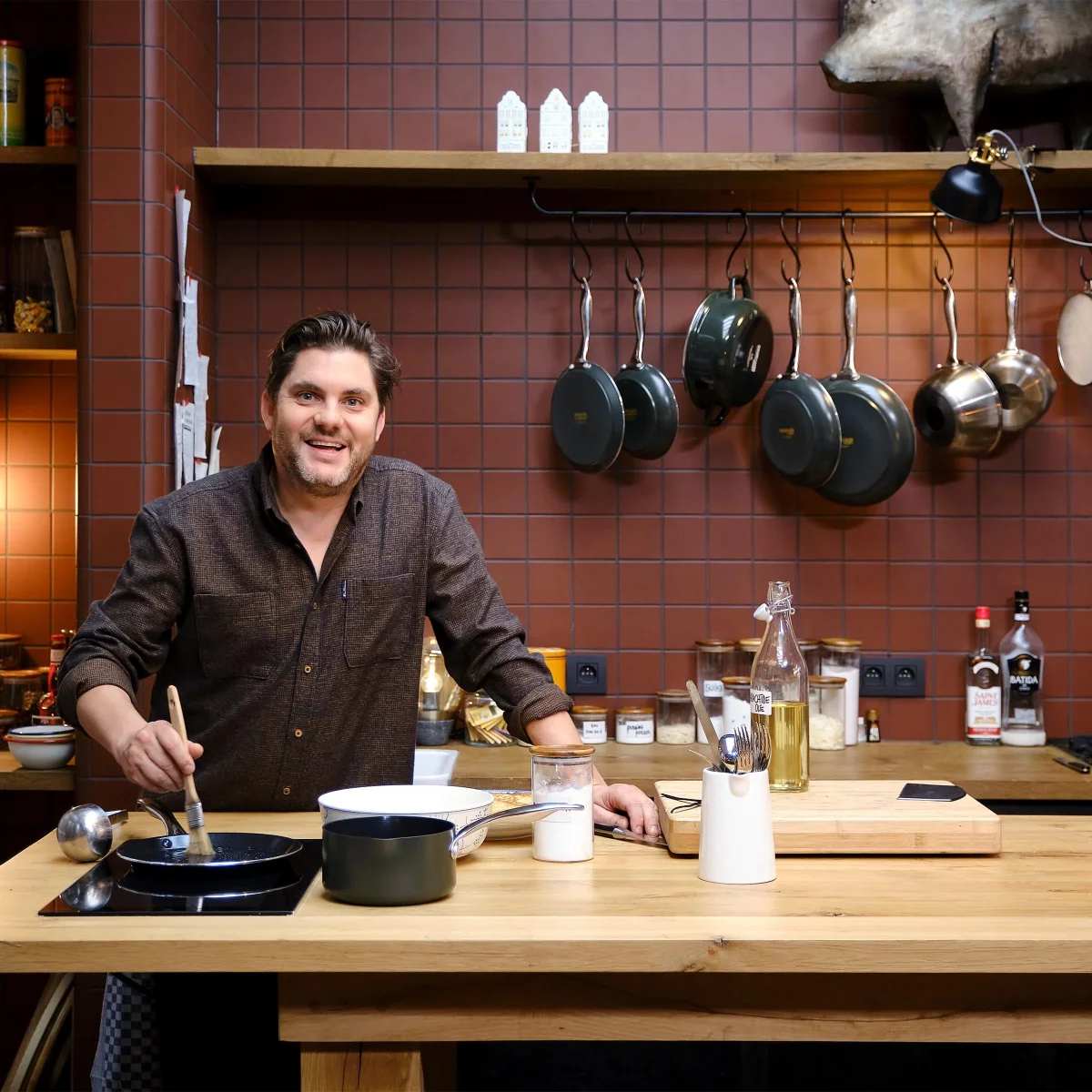 De aluminium pannen van Dagelijkse Kost hebben een keramische antiaanbaklaag die gemaakt is op basis van zand en nooit schadelijke stoffen of dampen zal vrijgeven, al raakt je pan per ongeluk oververhit. De coating geleidt de warmte snel en gelijkmatig, is zonder moeite schoon te maken en mag ook in de vaatwas, en zorgt voor een perfect korstje op je vlees of vis. De pannen hebben een ovenvaste greep in roestvrijstaal, kunnen op alle vuren inclusief inductie en zijn ovenvast tot 220°C. Echte allrounders dus, precies het soort pannen waarmee Jeroen Meus graag kookt. En het oog wil ook wat: deze collectie heeft een donker olijfgroene kleur en staat prachtig in elke keuken.