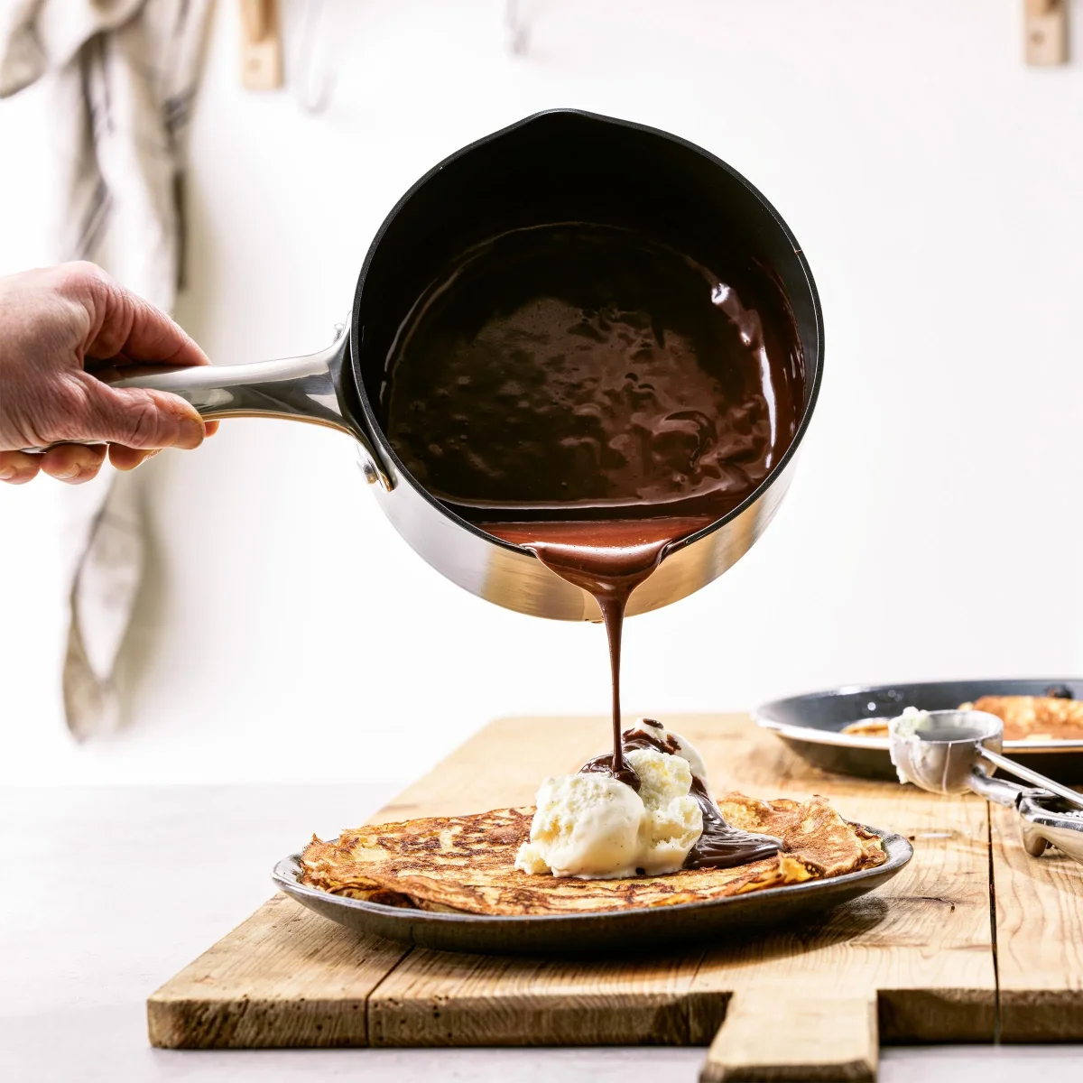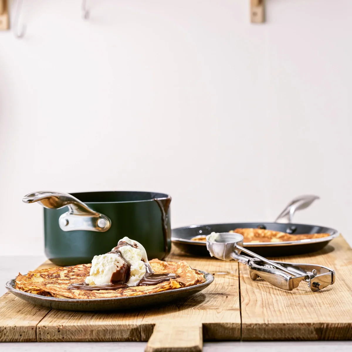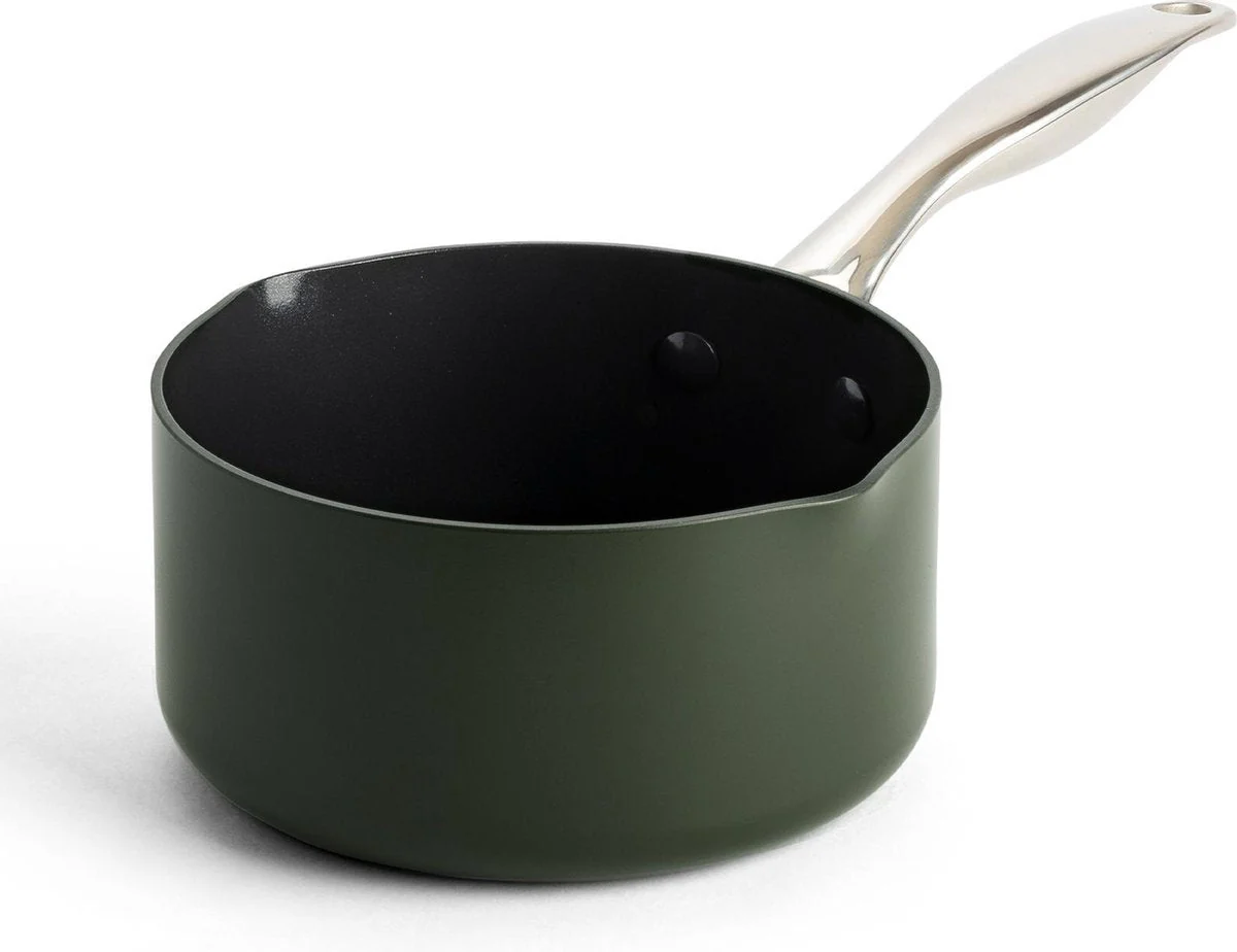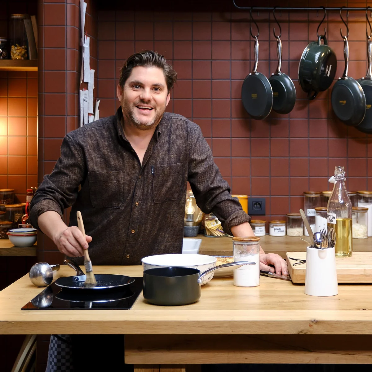 De aluminium pannen van Dagelijkse Kost hebben een keramische antiaanbaklaag die gemaakt is op basis van zand en nooit schadelijke stoffen of dampen zal vrijgeven, al raakt je pan per ongeluk oververhit. De coating geleidt de warmte snel en gelijkmatig, is zonder moeite schoon te maken en mag ook in de vaatwas, en zorgt voor een perfect korstje op je vlees of vis. De pannen hebben een ovenvaste greep in roestvrijstaal, kunnen op alle vuren inclusief inductie en zijn ovenvast tot 220°C. Echte allrounders dus, precies het soort pannen waarmee Jeroen Meus graag kookt. En het oog wil ook wat: deze collectie heeft een donker olijfgroene kleur en staat prachtig in elke keuken.