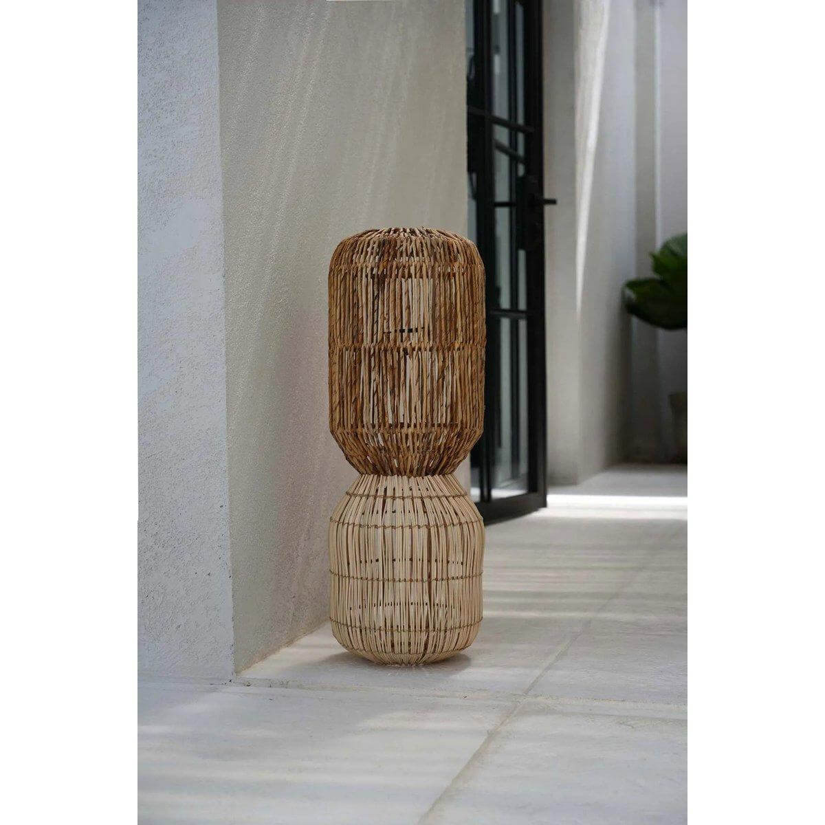 Of het nu boven het hoofd hangt of gestileerd is als een vloerlamp, het vult uw ruimte met een warme, gevlekte gloed die kalm en comfort uitnodigt. Ideaal voor Boho, rustieke of strand-geïnspireerde instellingen, dit stuk voegt ritme en diepte toe zonder overweldigend.