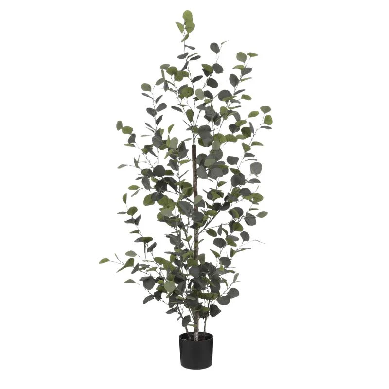 De Eucalyptus is een siervolle plant die elan geeft aan ongeacht welk interieur. Deze kunstplant van Mica Decorations is tot in detail dusdanig nagemaakt dat hij bijna niet van echt te onderscheiden is. Hij heeft elegant gewelfde stengels welke voorzien zijn van tegenover elkaar aangebrachte kleine, ronde bladeren. De plant heeft een hoogte van 150 cm en een doorsnee van ongeveer 30 cm. Hoewel hij niet met de karakteristieke rustgevende geur wordt geleverd heeft hij wel een rustgevend uiterlijk en is hij onderhoudsvriendelijk. De eucalyptus kunstplant wordt geleverd in een zwarte pot met een afmeting van 17 cm hoog en een diameter van 12 cm.