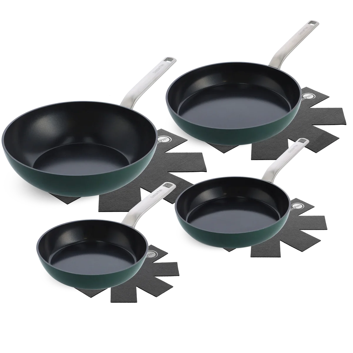 Deze collectie in trendy donkergroen, heeft een slim design met een hart voor de planeet. De items bevatten gerecycleerd aluminium en hebben een afneembaar roestvrijstalen handvat. Daardoor kunnen ze makkelijk gerecycleerd worden. Er is ook minder CO2-uitstoot bij het transporteren van deze producten dankzij een kleinere verpakking. Goed voor de planeet en bovendien ziet deze collectie er fantastisch uit! Bij levering is de handgreep nog niet bevestigd op de pan. Dat doe je eenvoudig zelf aan de hand van ons handig stappenplan dat je in de verpakking kan terugvinden.