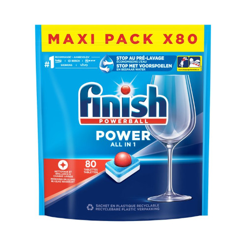 De hersluitbare verpakking bevat 80 Finish Powerball all-in-one vaatwastabletten.