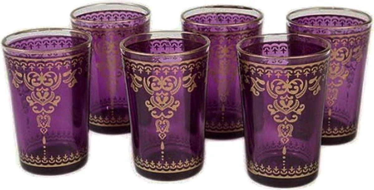Mooie gekleurde en met goud versierd Marokkaanse theeglazen. Ook leuk om als decoratie te gebruiken. Ook leuk om te combineren met een Marokkaanse dienblad en een Marokkaanse ‘Berrad’ Theepot.