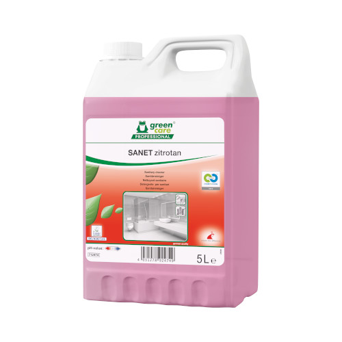 Green Care Sanet Zitrotan is een duurzame sanitairreiniger o.b.v. citroenzuur. Sanet Zitrotan geeft al bij een kleine dosering een optimaal resultaat. Verwijdert vuil, kalkaanslag, watervlekken en zeepresten in sanitaire ruimtes. Laat geen strepen of sluiers achter en geeft een frisse, aangename citroengeur af.