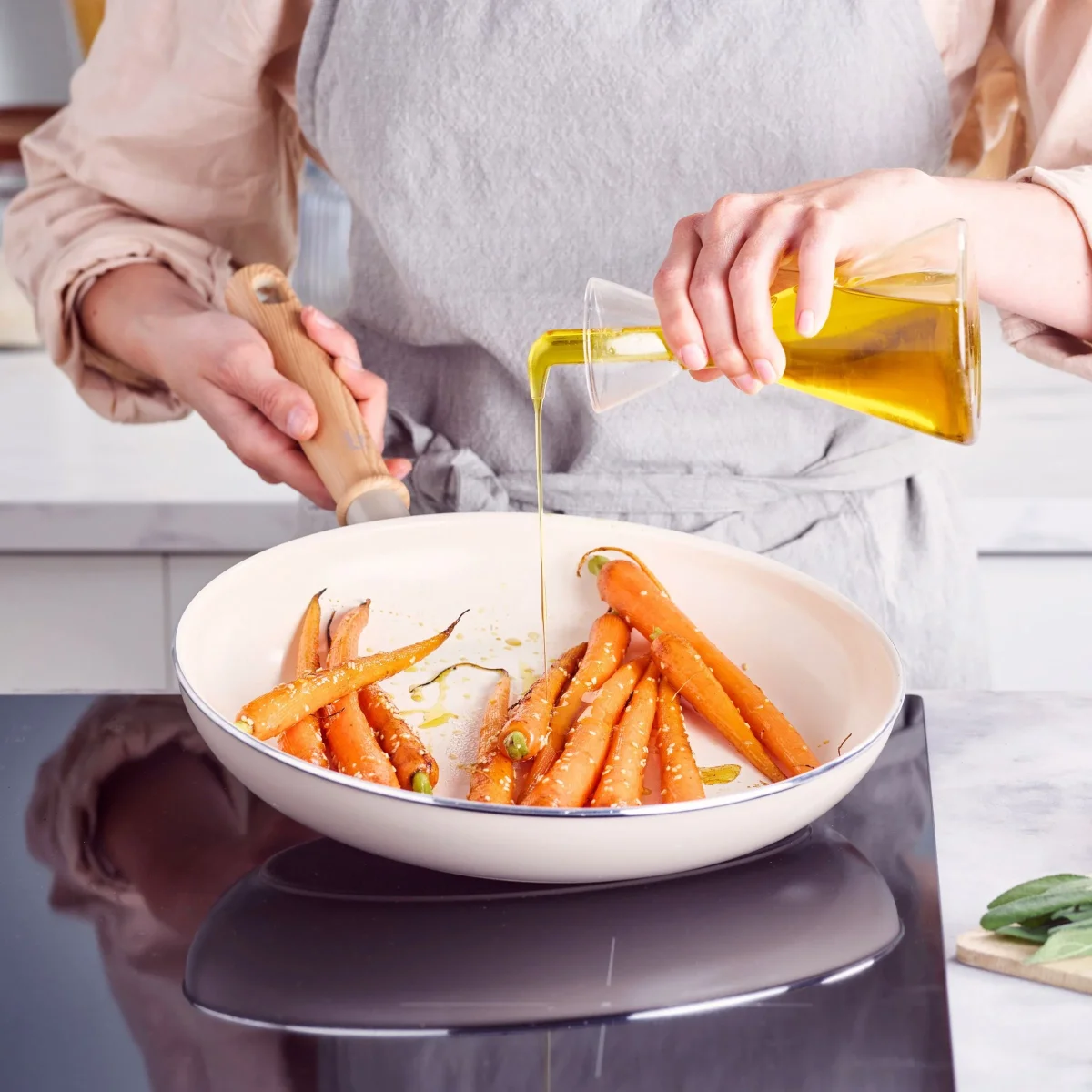 De pan heeft een hoogwaardige PFAS-vrije Thermolon™ keramische antiaanbaklaag. Die helpt je gezonder bakken, met minder boter of olie, en is heel makkelijk schoon te maken. De verstevigde rand zorgt ervoor dat de pan tegen een stootje kan. Klop je je spatel of lepel wel eens af op de rand? No worries! Bovendien geniet je met deze pan op elk fornuis van een fantastische kookervaring, dankzij de speciale inductiebodem.