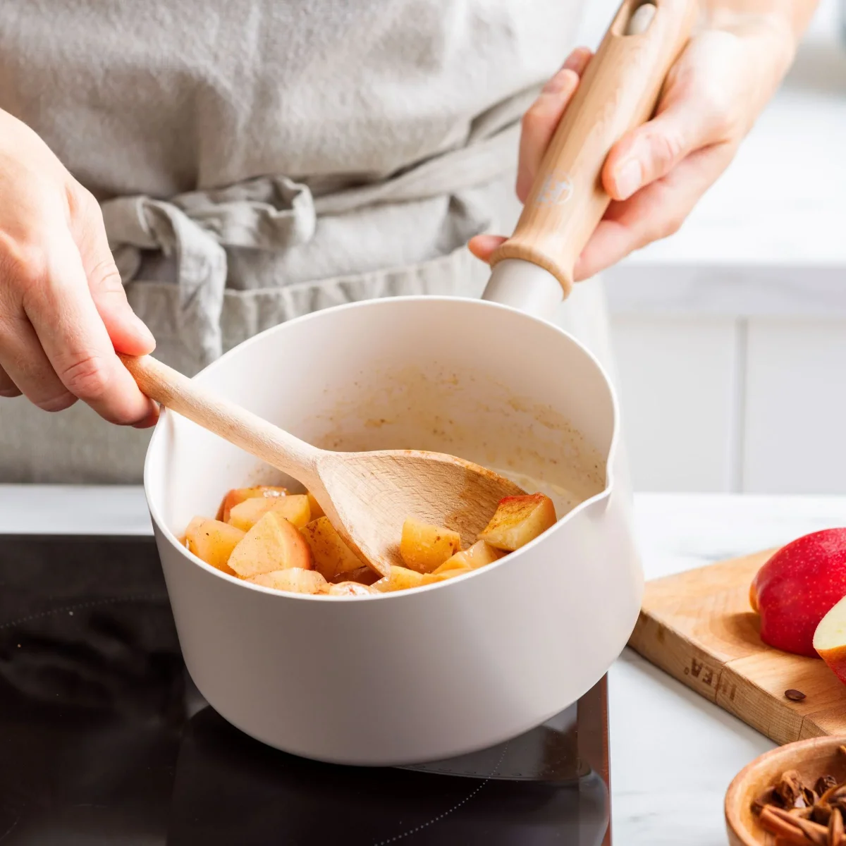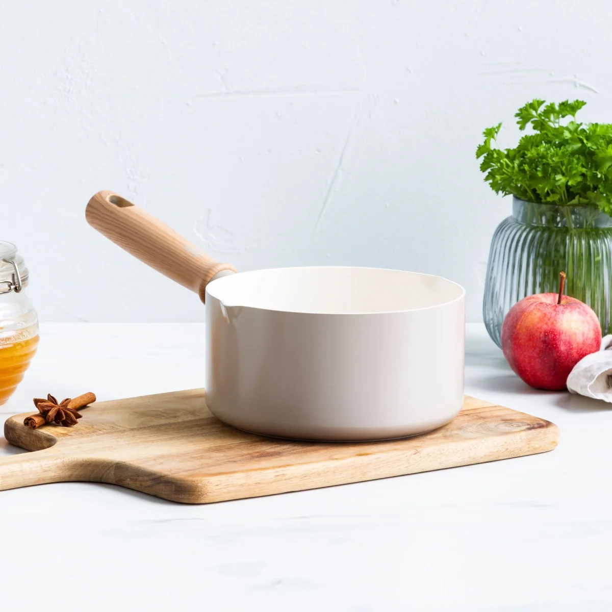 Mooi in zijn eenvoud, functioneel in de keuken! Zo kun je de GreenChef Nordics collectie best omschrijven. Deze pan heeft een body in kwalitatief aluminium, waardoor ze gelijkmatig opwarmt. De natuurlijke kleur van de pan past mooi bij de stay-cool handgreep met houteffect.