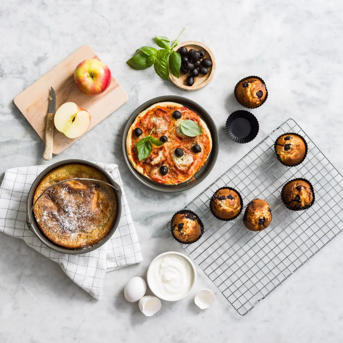 De quiche- en pizzavorm, en de bakvorm hebben een geavanceerde PFAS-VRIJE keramische antiaanbaklaag. De muffinvormen zijn gemaakt van gladde silicone. Deze 8-delige set is geschikt voor alle airfryermanden met een minimale inhoud van 6 liter.
