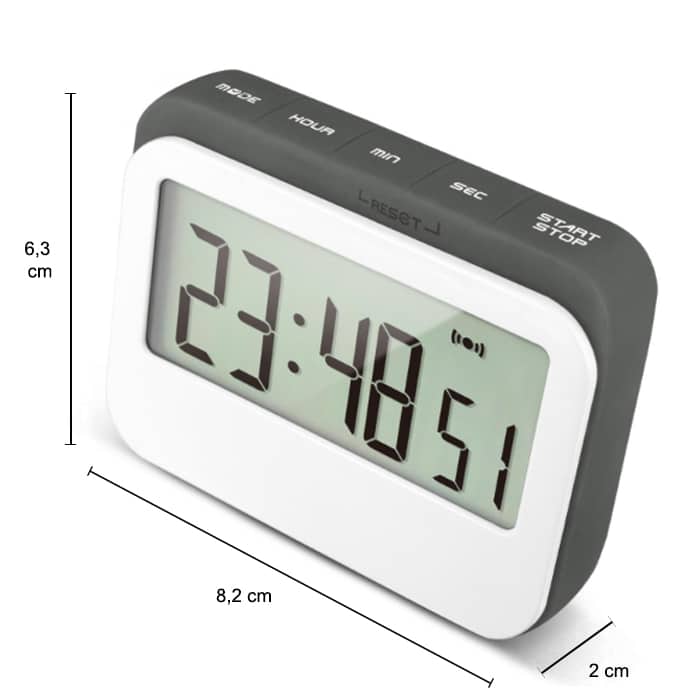 De grijze keuken wekker kan je neerzetten met of zonder het uitklapbare steuntje. Daarnaast is de achterkant van de wekker magnetisch zodat je deze bijvoorbeeld op de afzuigkap of koelkast kan ‘plakken’.
