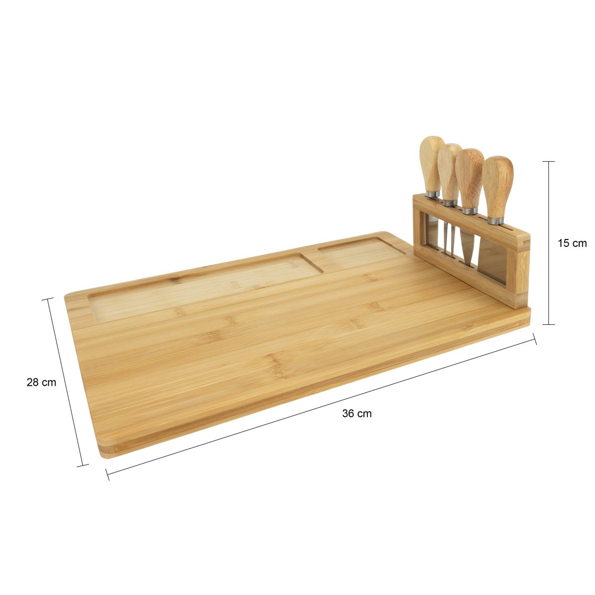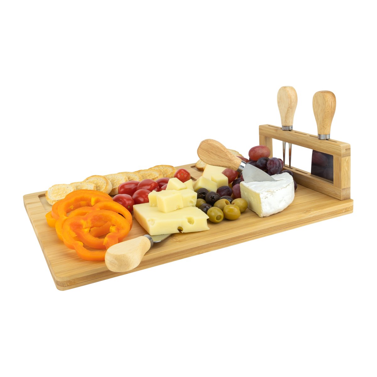 Een heerlijk kaasplankje mag tijdens de borrel niet ontbreken. Serveer de kaas voortaan op deze praktische én stijlvolle kaasplank inclusief messenset van Krumble. Deze tapasplank is gemaakt van bamboe en heeft een natuurlijk uiterlijk. Door de handige indeling en de complete messenset die bij de plank hoort, wordt een borrelavond nog leuker. Zo heeft de plank plek voor toastjes, is er voldoende plek voor andere hapjes en hebben de messen een eigen houder. Zo heb je alles bij de hand om optimaal te genieten.