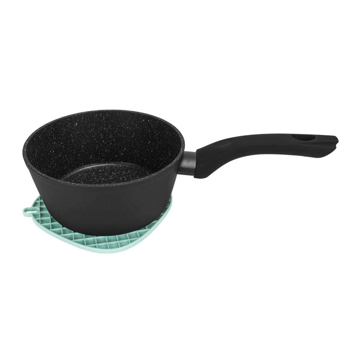 De lichtblauwe pannenonderzetter heeft een mooi design