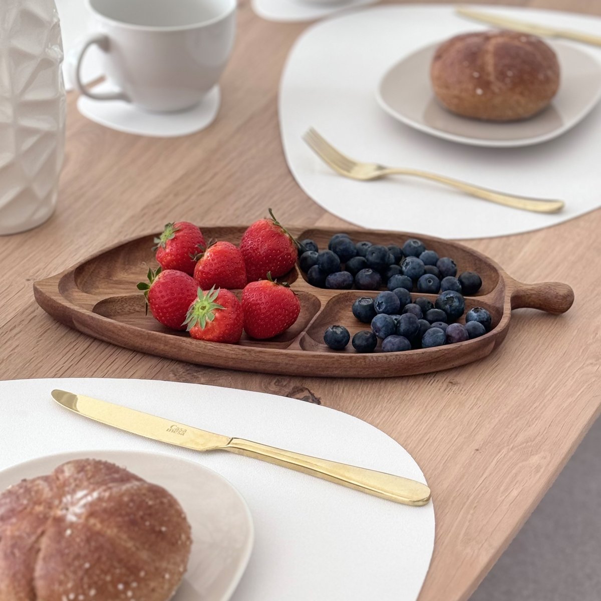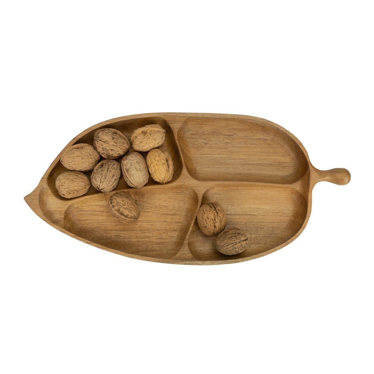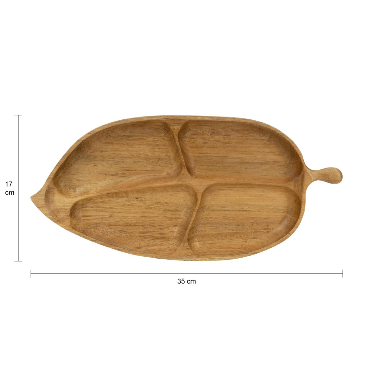 Het kan zomaar zo zijn dat er iemand in het gezelschap te maken heeft met een bepaalde allergie of er is een duidelijke voorkeur voor een dieetwens. Echter wil je natuurlijk wel het hele gezelschap tevreden houden en voor ieder wat wils kunnen bieden. Gelukkig is deze handige serveerplank in bladvorm van hout voorzien van een aantal aparte vakjes. Hierdoor zijn diverse producten net even wat makkelijker van elkaar te scheiden .