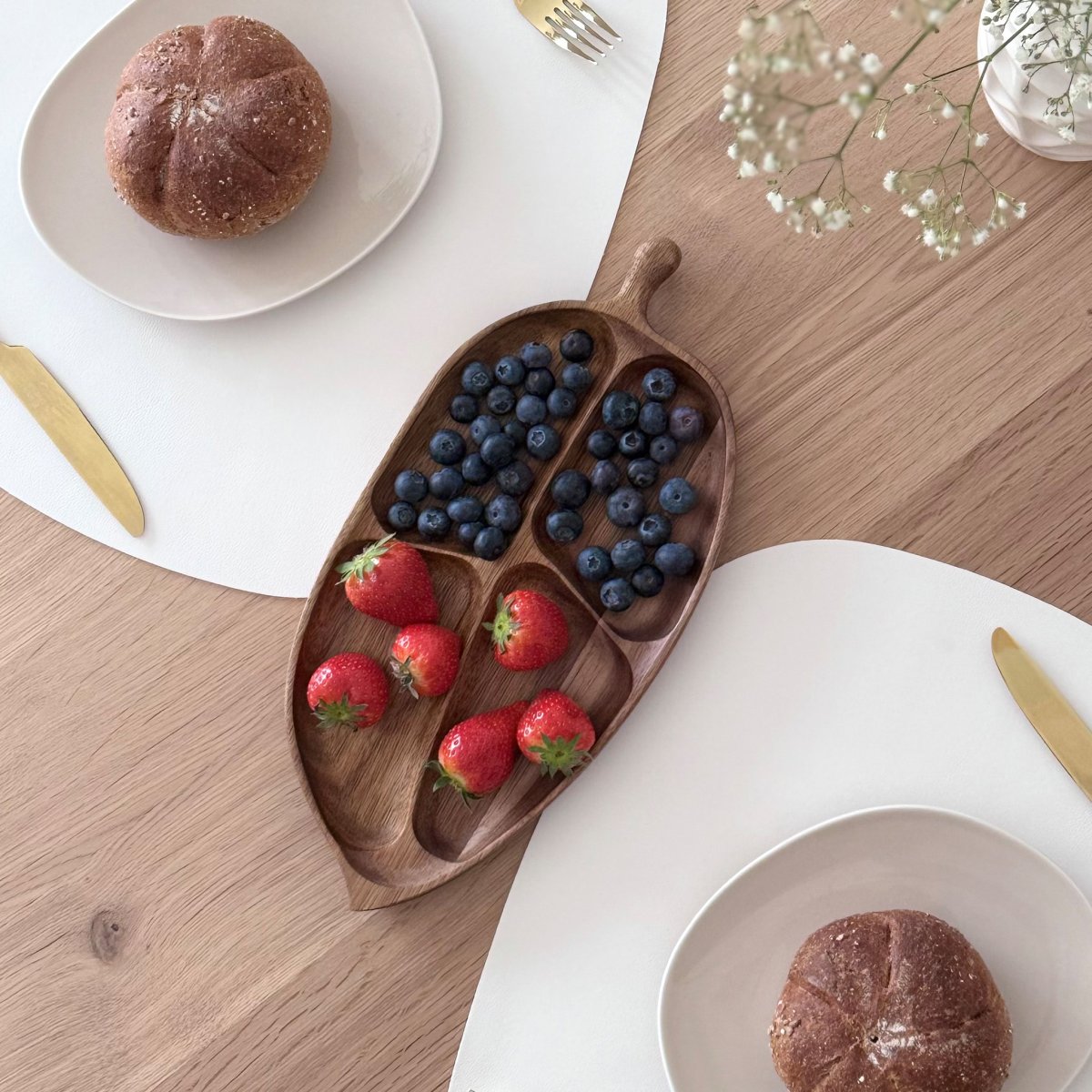 Makkelijk van elkaar te scheiden met de serveerplank in bladvorm van hout