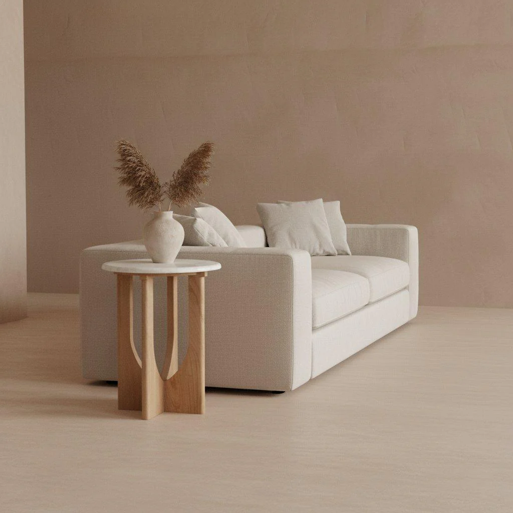 De Kuching bijzettafel marmer wit brengt licht en rust in huis. Met zijn frisse witte marmeren blad en het warme, naturel mangohouten onderstel vormt deze tafel een kalm middelpunt in de ruimte. Het ontwerp is eenvoudig, maar geeft een gevoel van harmonie en aandacht voor detail — precies wat past binnen een modern, Japandi of Scandinavisch interieur.