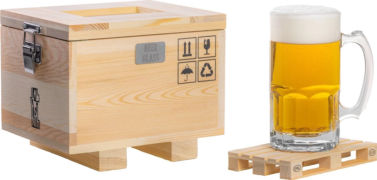 Labyrinth -Bierglas in houten kist (27x21x21 cm) met houten onderzetter – 1 liter bierpul – cadeauset
