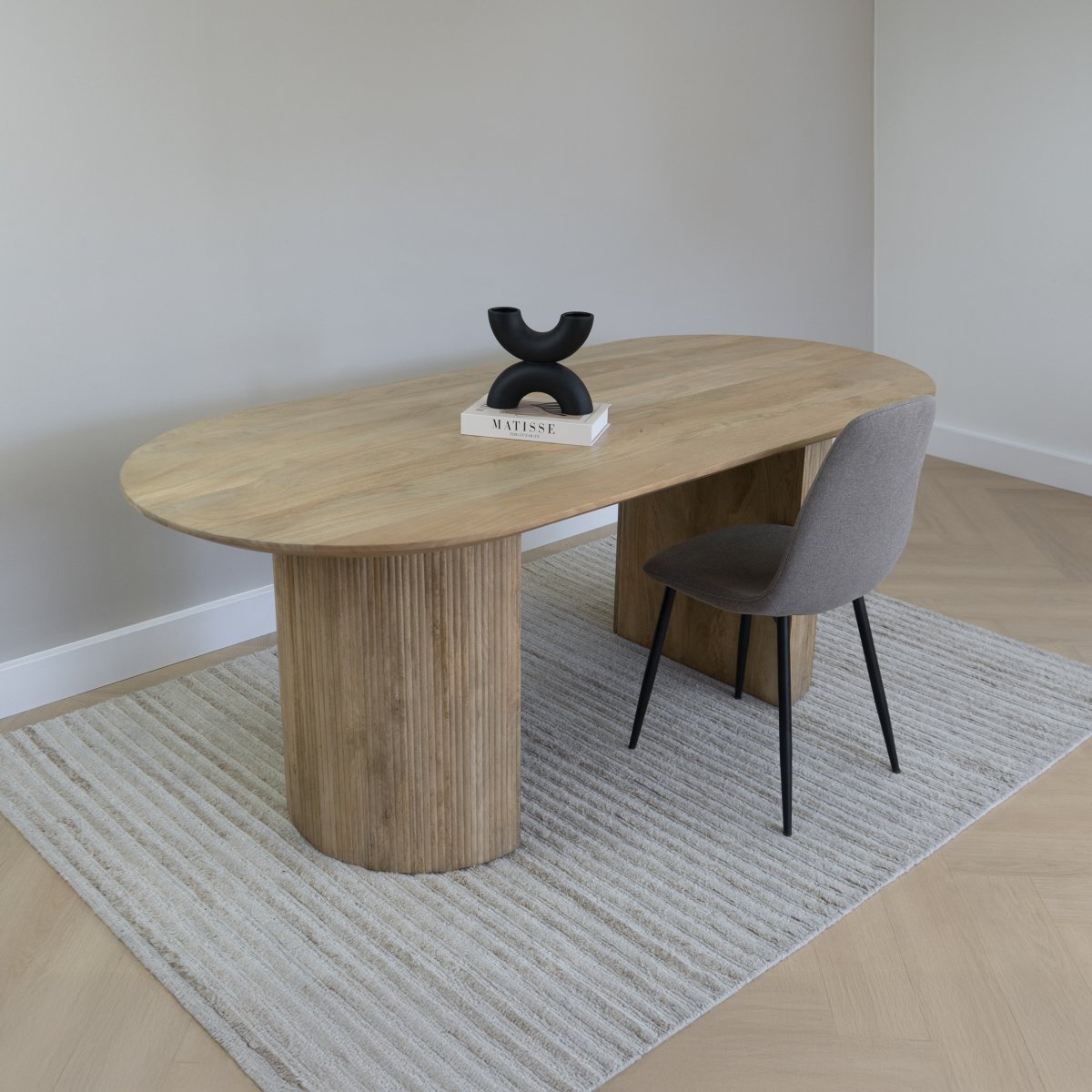 Een ovale eettafel van hout die perfect past in een Japnadi interieur