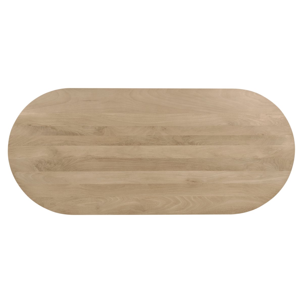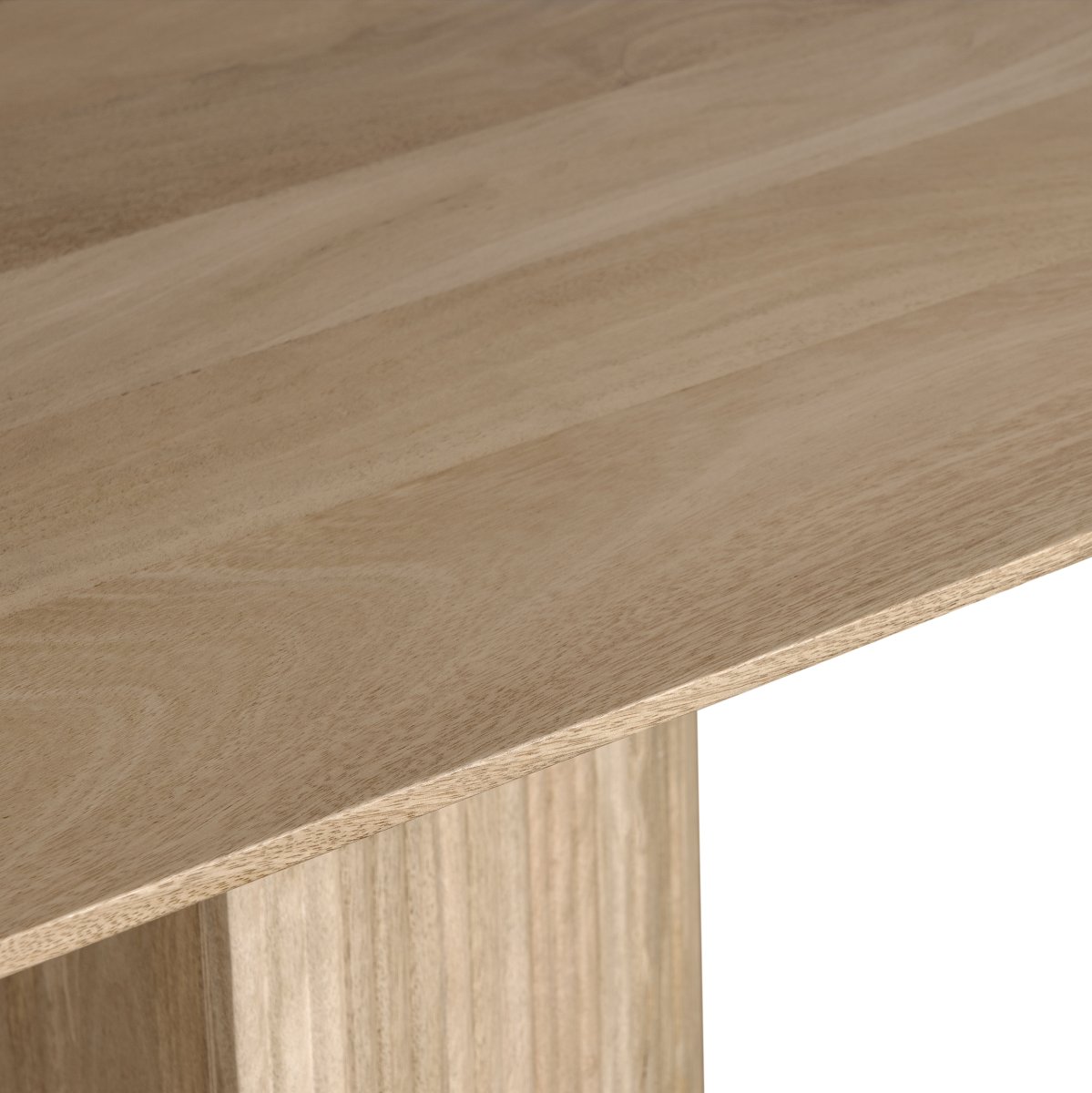 Wat deze eettafel van hout bijzonder maakt, is het onderstel: twee halve cilindervormige poten vormen samen een sculpturaal en modern fundament. Dit onderstel geeft de tafel stabiliteit én een uniek silhouet. Het contrast tussen de strakke vormen van het onderstel en de warme kleur van het mangohout zorgt voor een uitgebalanceerde en luxe uitstraling.
