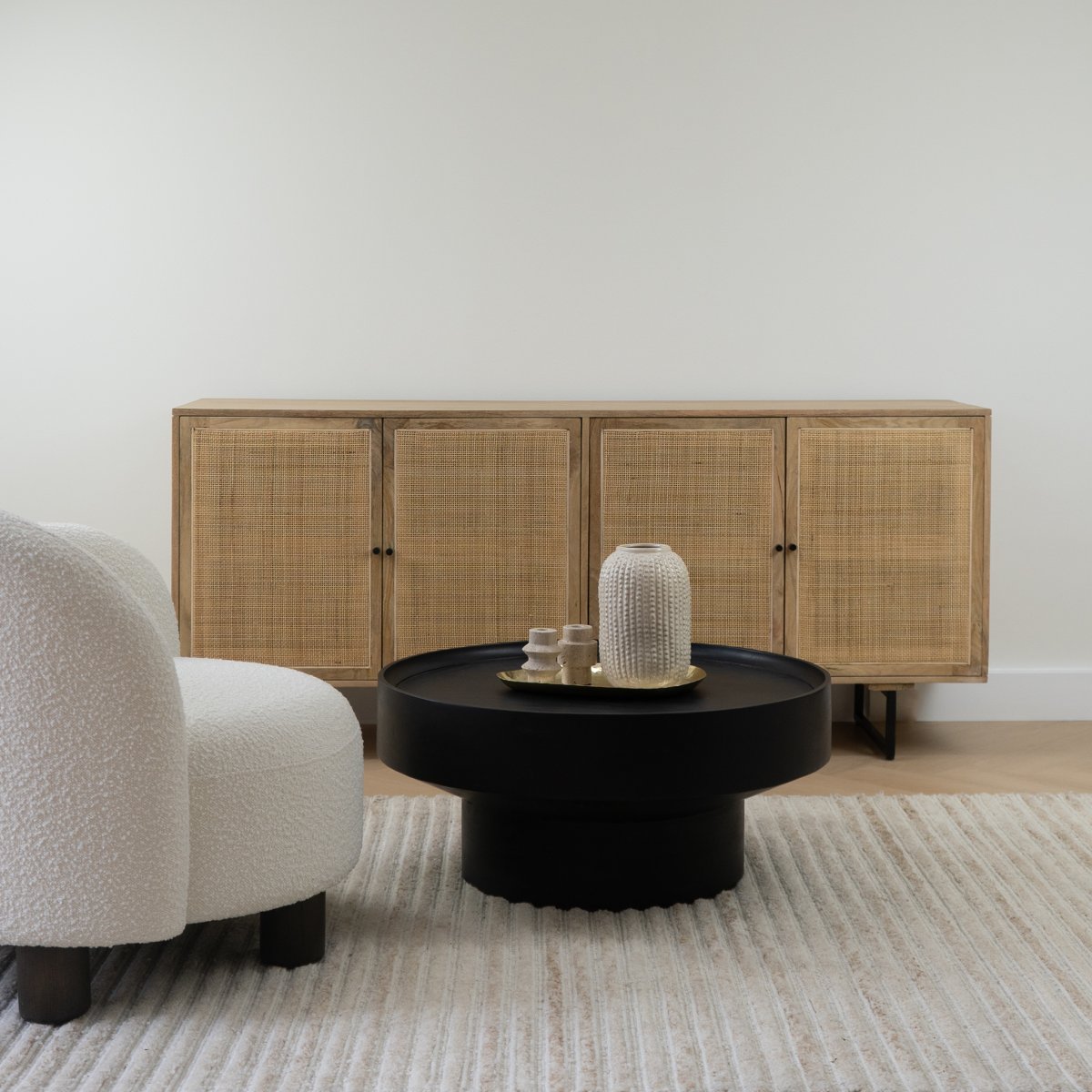 Deze salontafel rond is gemaakt van duurzaam mangohout, dat niet alleen stevig is, maar ook een warme uitstraling heeft. Het hout is FSC®-gecertificeerd, wat betekent dat het afkomstig is uit verantwoord beheerde bossen. De zwarte afwerking geeft de tafel een eigentijdse look die goed past bij zowel moderne als klassieke interieurstijlen.
