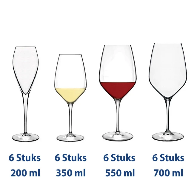 De wijnglazen uit deze complete set wijnglazen van Luigi Bormioli zijn gemaakt van kraakhelder kristalglas en zijn vaatwasserbestendig. Deze complete set wijnglazen uit de Atelier serie bestaat uit 24 glazen en bevat de volgende sets: