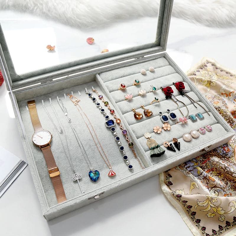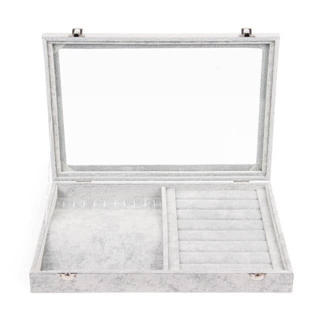 Wellicht heb je jouw kettingen, ringen, armbanden en andere sieraden op verschillende plekken in huis slingeren. Dat is verleden tijd met de fluwelen sieradendoos van LYVION. Ze zitten in kleine zakjes, zijn terug te vinden in de badkamer of liggen rommelig in een lade. Met de handige fluwelen sieradendoos van LYVION berg je al jouw sieraden op op één plek. Doordat de LYVION fluwelen sieradendoos gesloten is, blijven de juwelen stofvrij bewaard. Niet alleen blijven je juwelen mooier, door het display heb je ook nog eens een beter overzicht van de collectie die je al hebt. De bovenzijde van het sieradendisplay is transparant, terwijl de rest van het product is gemaakt van fluweel materiaal.