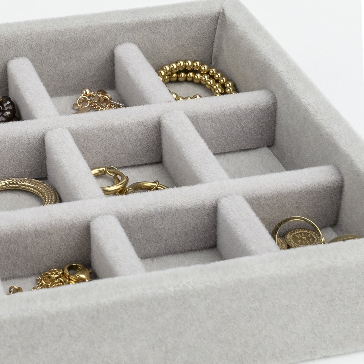 Dit sieradendoosje met 15 vakken past door het formaat prima in de la van bijvoorbeeld je make-up tafel. Bewaar jij je sieraden liever in het zicht? Door de luxe uitstraling van het grijze fluwelen doosje is dat met dit sieradenkistje ook geen probleem. Zet het sieradendoosje bijvoorbeeld op de slaapkamer of in de badkamer. Zo weet je altijd precies waar je juwelen zijn en pak je ze snel en gemakkelijk als je ze nodig hebt.