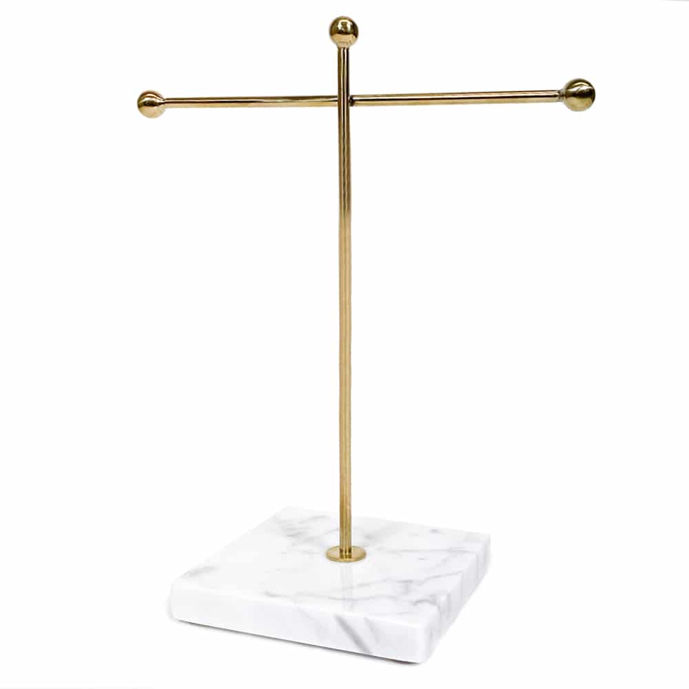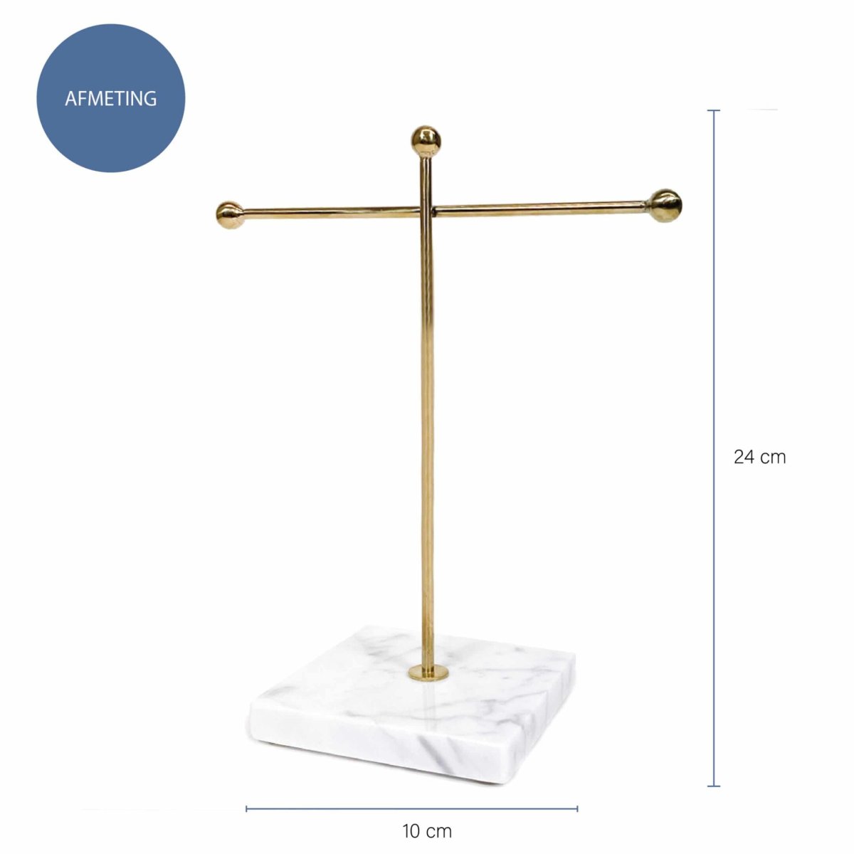 De meeste sieradenstandaarden bestaan uit zwarte buizen, die alleen voor armbanden en horloges te gebruiken zijn. Soms zijn ze ook nog eens van een soort fluweel gemaakt waardoor vuil en stof moeilijk te verwijderen zijn. Deze LYVION sieradenstandaard is daarentegen gemaakt van metaal en heeft twee armen, waardoor het mogelijk is om armbanden, grote oorbellen, lange kettingen en ringen op te bergen. Daarnaast is de sieradenstandaard onderhoudsvriendelijk. Het houdt geen stof vast en is makkelijk af te doen met een doekje. Daarnaast is het een lust voor het oog. Het trendy marmer tekent mooi af tegen het gouden metaal. Een tijdloze en luxueuze combinatie. Homeliving heeft een groot assortiment sieraden accessoires. Bekijk de categoriepagina sieradenhouders om een kijkje te nemen bij andere sieradenstandaard.