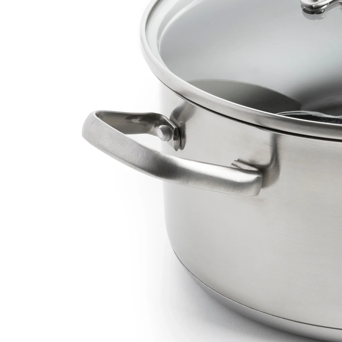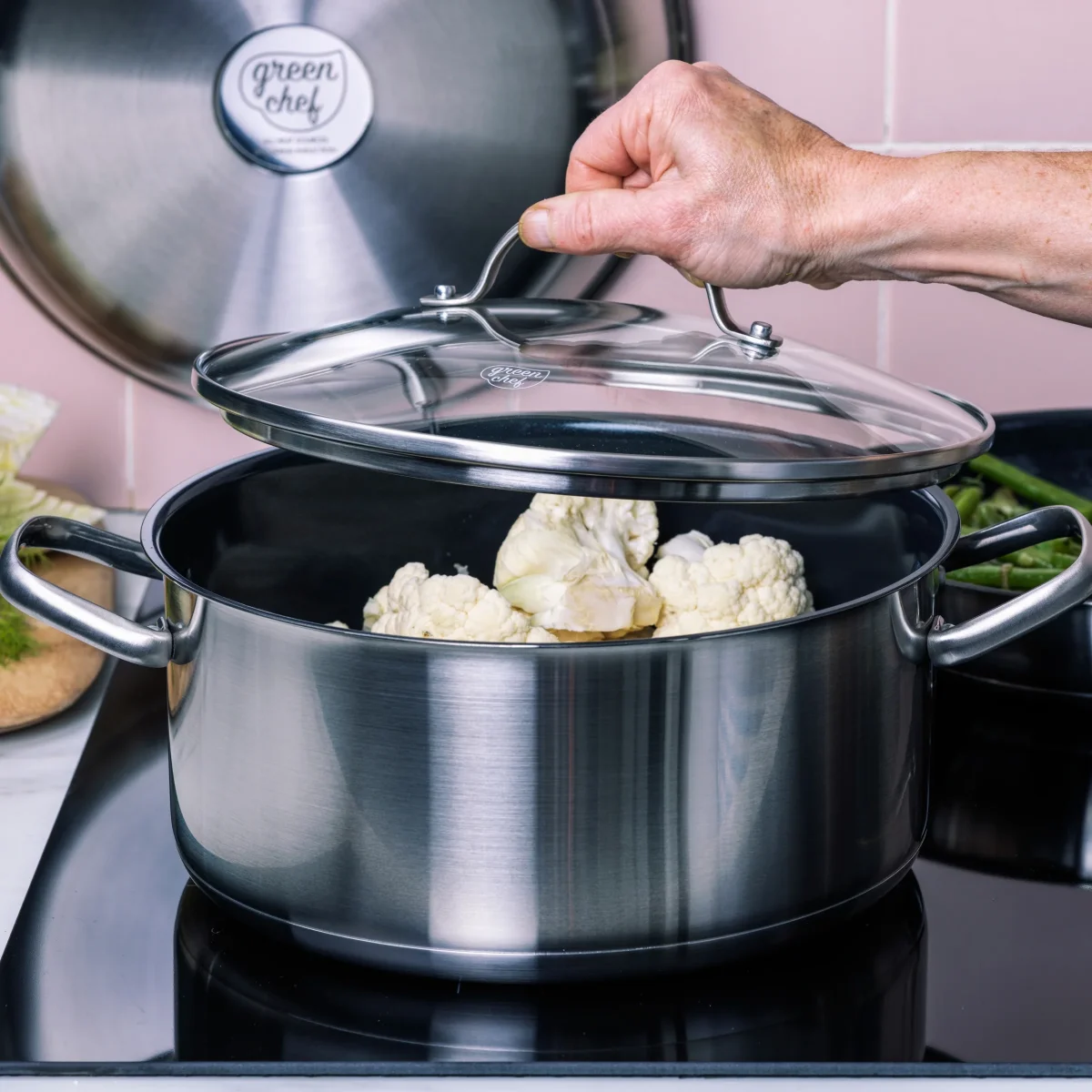 Geef je keuken een professionele toets met deze prachtige collectie! Het design in geborsteld roestvrij staal zorgt voor een stijlvolle look en is makkelijk in onderhoud. De reeks werkt uitstekend op alle warmtebronnen, ook inductie en is voorzien van een gezonde keramische antikleeflaag. Ze mag ook in de oven en in de vaatwasser voor optimaal gebruiksgemak. Alles wat je nodig hebt om elke dag gemakkelijk en gezond te koken mét klasse!