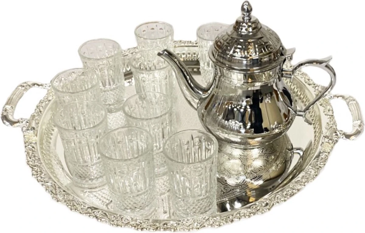 Met deze Marokkaanse theeset serveert u met gemak een lekkere Marokkaanse munt thee . De theepot van deze set heeft een inhoud van 1.5 liter en de dienblad heeft een diameter van 45 cm.