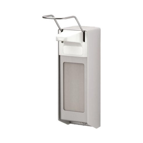 Middels de bedieningsbeugel neem je de handreiniger uit. Het materiaal van deze dispenser is aluminium en het is afgewerkt met een matzilver geëloxeerde kleur.