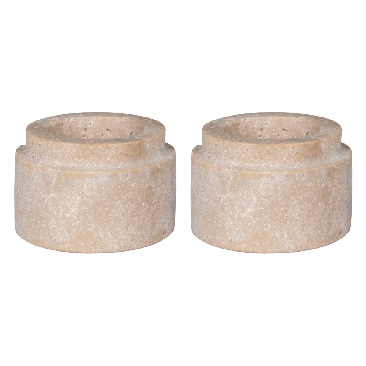 Travertijn is een sterke, duurzame en van nature hittebestendige natuursteen, waardoor deze kaarshouders bij normaal gebruik lang mooi blijven. Door het gewicht van het steen staan de theelichthouders stabiel, ook op gladde oppervlakken zoals glas of gelakte meubels. Gebruik standaard theelichtjes in het metalen cupje voor een nette, veilige verbranding. Qua onderhoud zijn de houders zeer praktisch: stofvrij maken met een zachte, droge doek en indien nodig licht vochtig afnemen. Vermijd agressieve schoonmaakmiddelen om de natuurlijke uitstraling en subtiele glans van het travertin te behouden. Dankzij de compacte afmetingen verplaats je de set eenvoudig van gedekte tafel naar nachtkastje of wandplank, waar ze direct sfeer, textuur en een verfijnde, natuurlijke look toevoegen aan je interieurstyling.