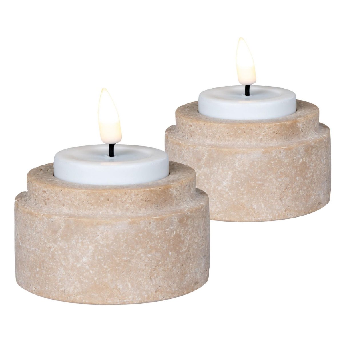 Deze travertin theelichthouders zijn vervaardigd uit echt natuursteen, bekend om zijn subtiele kleurnuances, natuurlijke poriën en zachte, matte textuur. Geen enkele houder is exact hetzelfde: elke set heeft een eigen tekening en schakering, waardoor je altijd een uniek woonaccessoire in huis haalt. Het materiaal voelt robuust en zwaar aan en zorgt voor een luxe, hotel chique uitstraling, zonder te schreeuwerig te zijn. De warme beige kleur werkt als een rustig anker in je interieur: plaats ze solo voor een minimalistisch statement of combineer ze met andere natuurlijke materialen zoals hout, linnen, wol en keramiek. Zo creëer je in een handomdraai een tijdloze basis voor sfeervolle verlichting tijdens etentjes, ontspannen avonden op de bank of een zachte gloed in de hal.