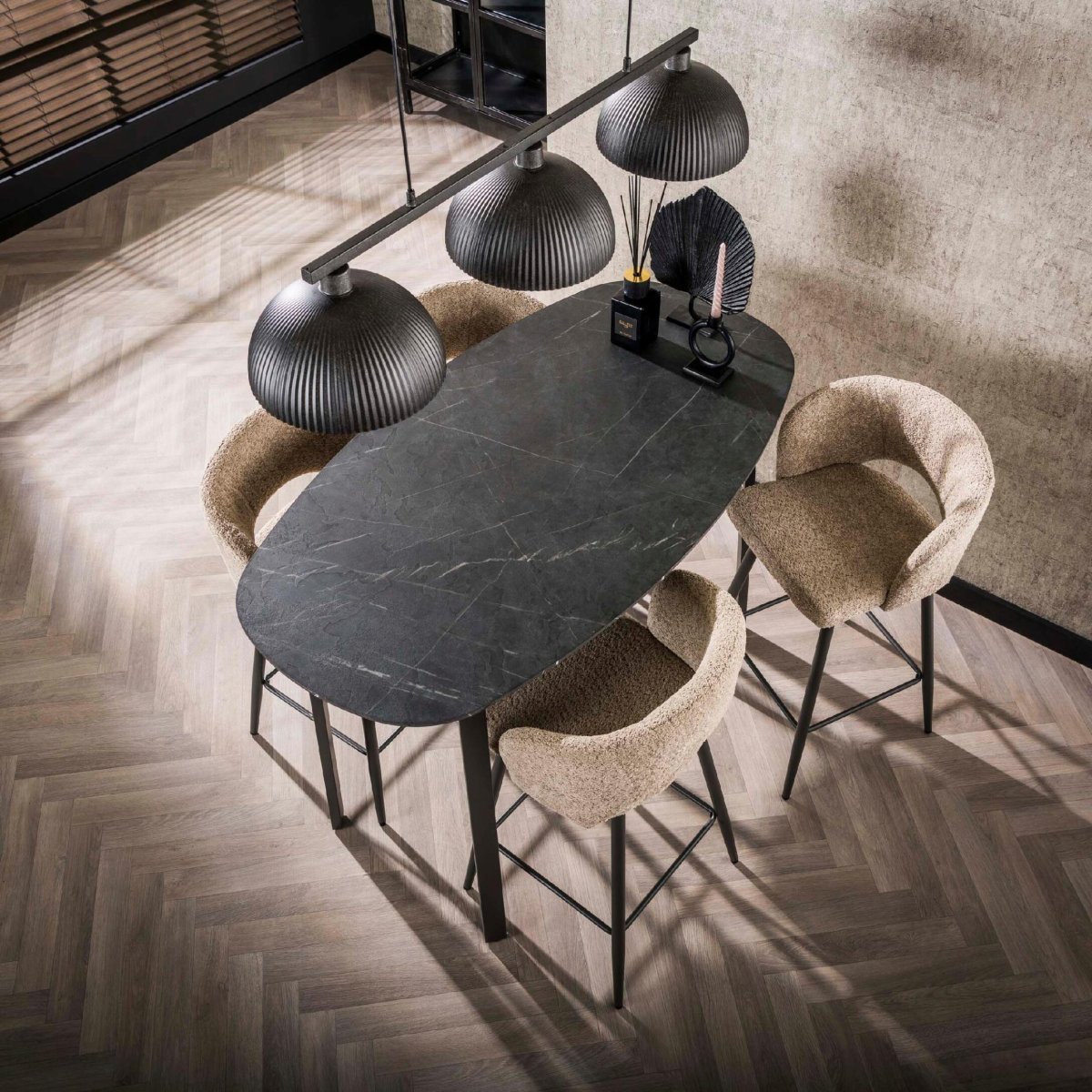 De Deens ovale vorm van deze bartafel geeft het blad een zachte, organische en vriendelijke uitstraling, terwijl je toch profiteert van een royaal bruikbaar tafeloppervlak. De afgeronde hoeken zorgen ervoor dat je makkelijk om de tafel heen beweegt, wat ideaal is in een kleinere keuken, compacte eetruimte of bij een kookeiland. Het blad heeft een realistische keramieklook, maar is uitgevoerd in duurzaam melamine. Hierdoor is de tafel lichter, praktischer en beter betaalbaar dan een bartafel met echt keramiek of steen, terwijl de luxueuze uitstraling behouden blijft. De verfijnde, verjongde rand geeft het blad een slank, elegant profiel dat mooi contrasteert met het stevige zwarte stalen frame. Zo krijg je een moderne bartafel die perfect combineert met barkrukken, design hanglampen en andere hedendaagse meubels in een Scandinavisch, industrieel of minimalistisch interieur.