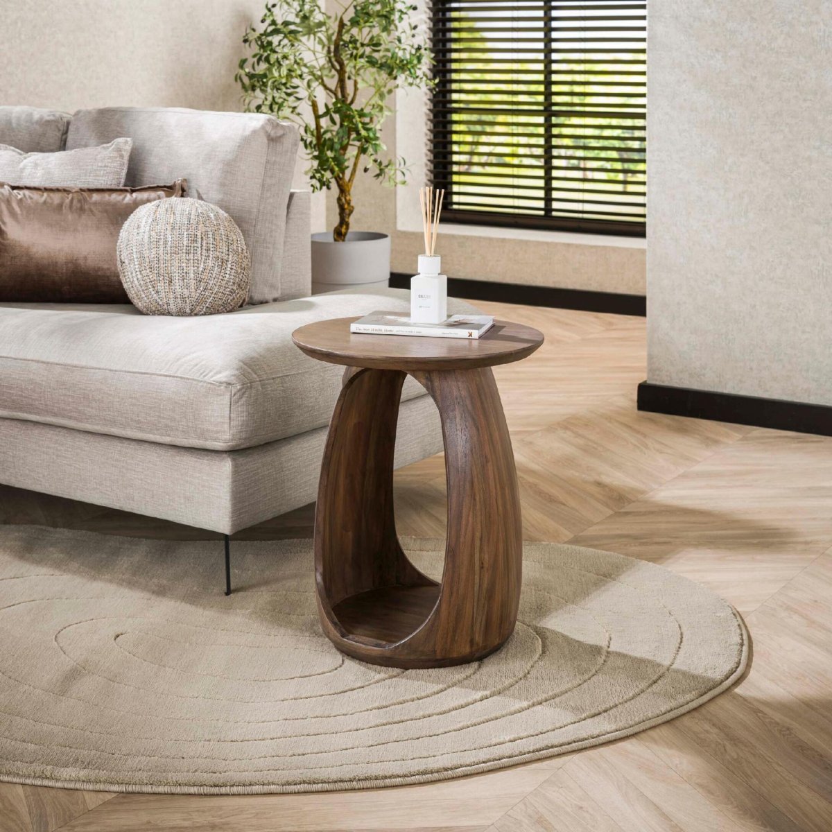 De kracht van deze bijzettafel zit in de combinatie van de ronde, organische vorm met het strakke, minimalistische design. De vloeiende lijnen geven het tafeltje een zachte, uitnodigende uitstraling en zorgen voor een mooi contrast met rechte banken, kasten en vloerkleden. Zo breng je direct meer diepte, balans en dynamiek in je interieur. Het tafelblad biedt voldoende ruimte voor een boek, tijdschriften, een tafellamp, geurkaars of een glas drinken, zonder massief te ogen. Door de elegante, luchtige vorm komt de tafel ook uitstekend tot zijn recht in kleinere ruimtes, studio’s of bij een compacte zithoek.