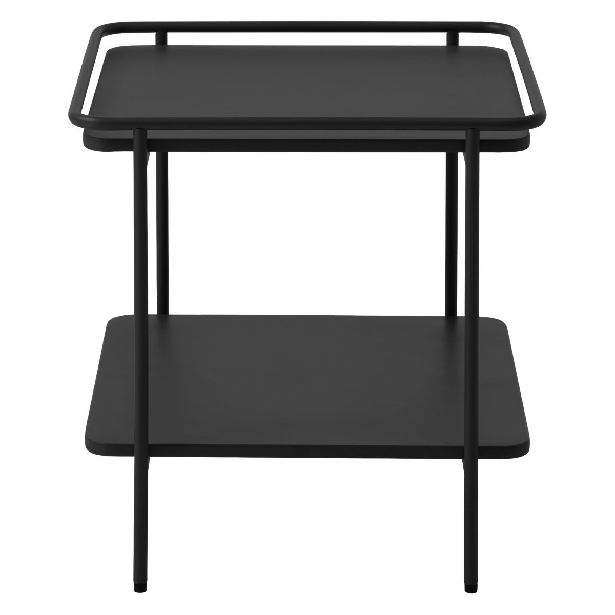 Deze vierkante bijzettafel met twee bladen is een strakke, moderne en veelzijdige aanvulling voor ieder interieur. Het zwarte metalen frame met vier poten en twee vierkante niveaus combineert industriële stijl met praktische functionaliteit. Dankzij het compacte formaat van 45×45 cm en een hoogte van 44,3 cm past deze zwarte metalen bijzettafel perfect naast de bank, als compacte salontafel, als plantentafel of als minimalistisch nachtkastje. Het ontwerp is strak en industrieel, de afwerking is onderhoudsvriendelijk en de dubbele legplank biedt extra opbergruimte voor woonaccessoires, boeken, mandjes of een tray met drankjes. Ben je op zoek naar een stevige, vierkante bijzettafel in zwart metaal met twee bladen? Dit model combineert stabiliteit, draagkracht en tijdloos design en laat zich moeiteloos integreren in moderne, Scandinavische en industriële woonstijlen.