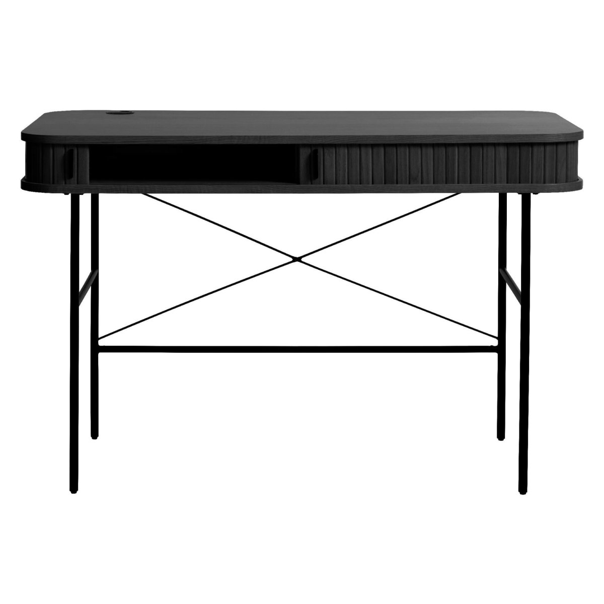 Een compact, stijlvol bureau voor je thuiskantoor, gaming setup of studeerkamer. Dit zwarte computerbureau met rechthoekig blad in black oak eikenfineer combineert een stabiel metalen frame met slimme oplossingen zoals geïntegreerde kabeldoorvoer en een royaal opbergvak met schuifdeuren. Dankzij het ruimtebesparende formaat past dit bureau perfect in kleinere ruimtes, terwijl het toch ruim genoeg werkoppervlak biedt voor laptop, monitor en accessoires. Ideaal als werkbureau, gaming bureau of studiebureau: strak design, praktische opbergruimte en georganiseerde kabels in één functioneel meubel.