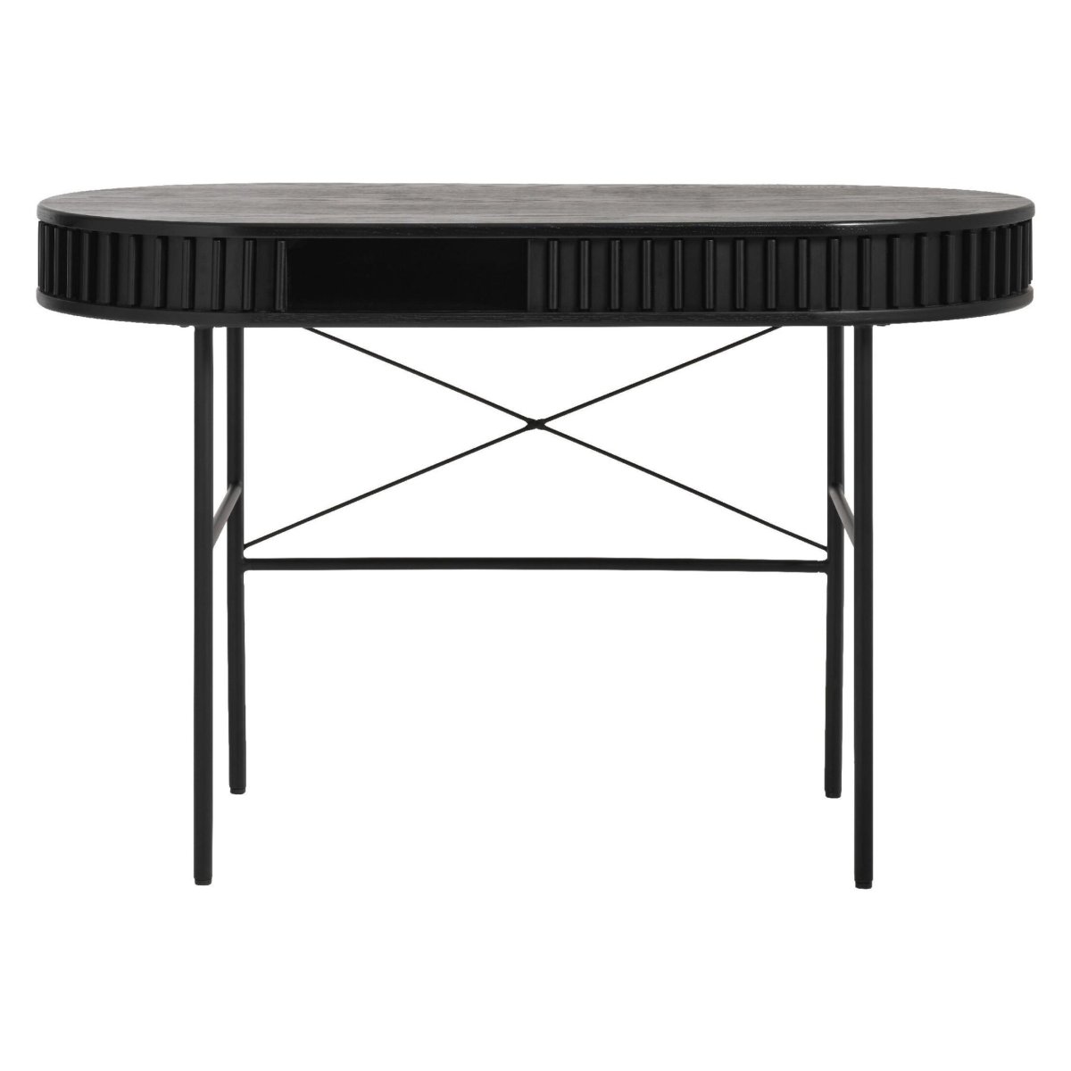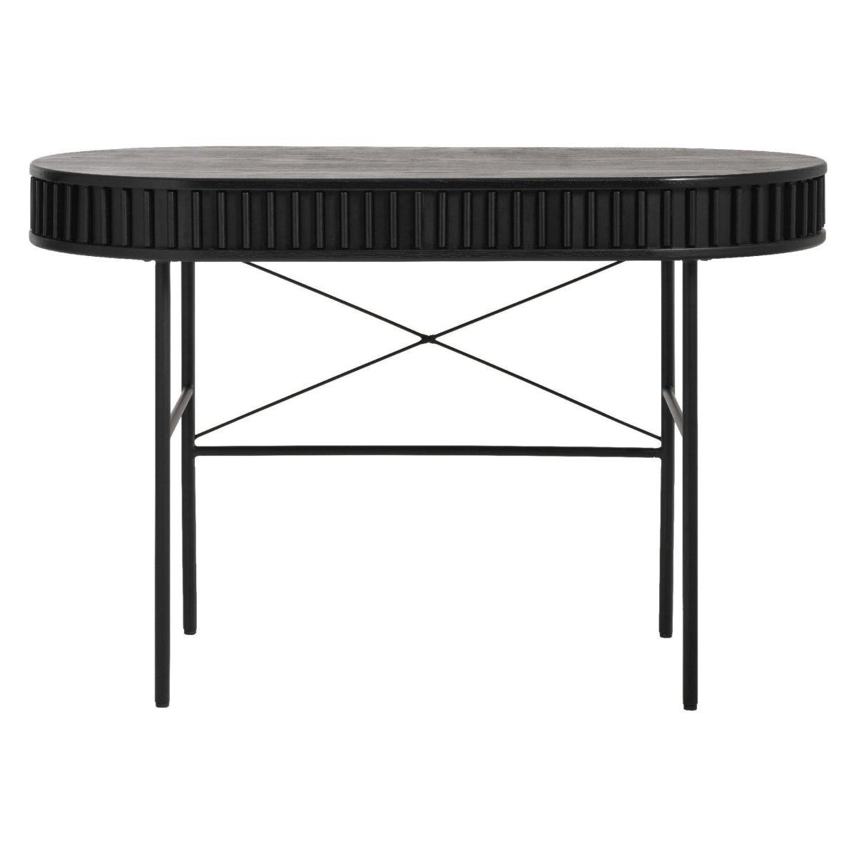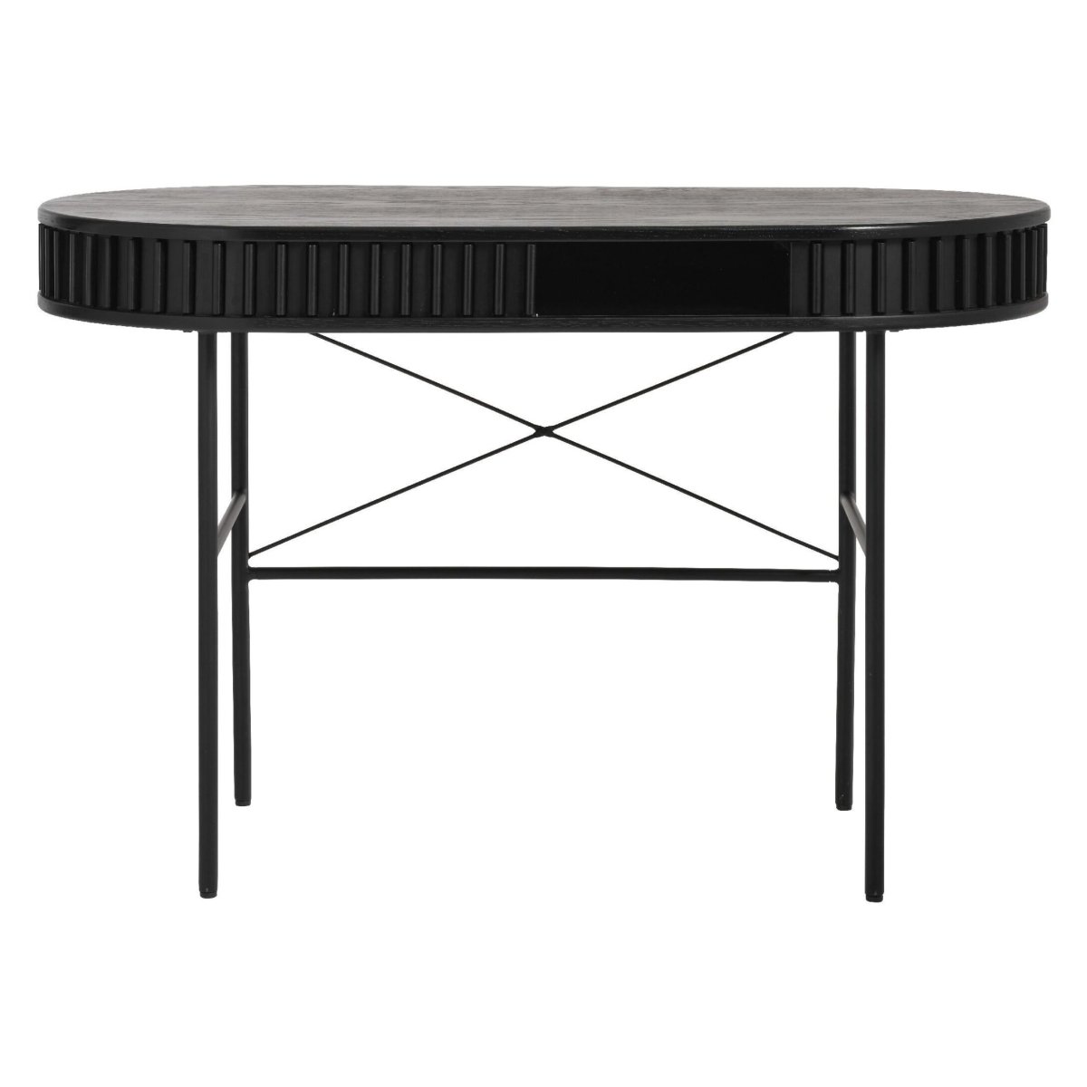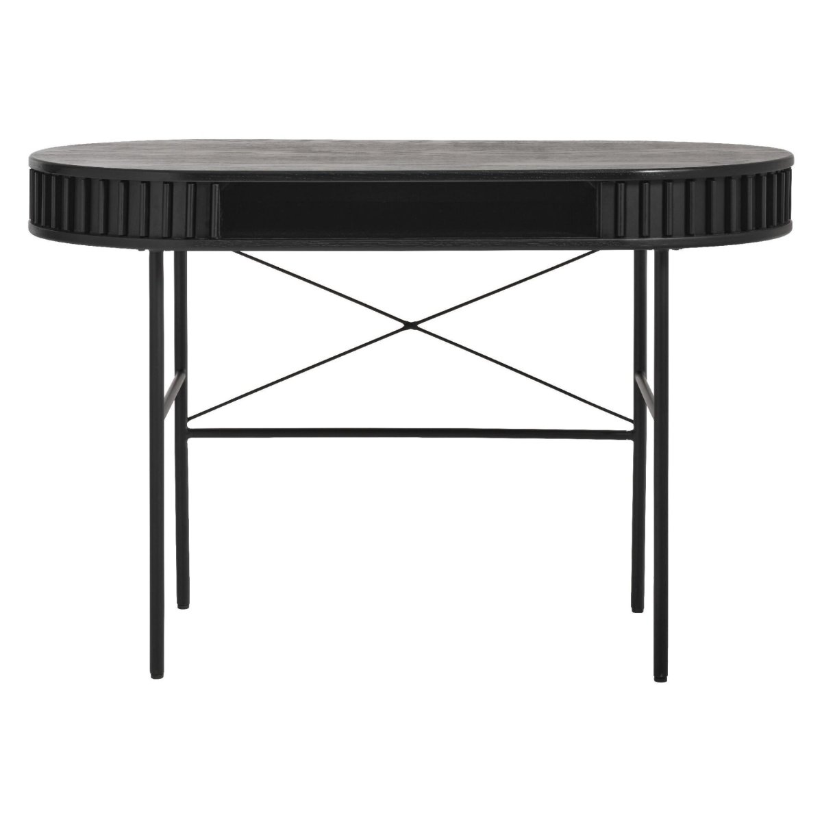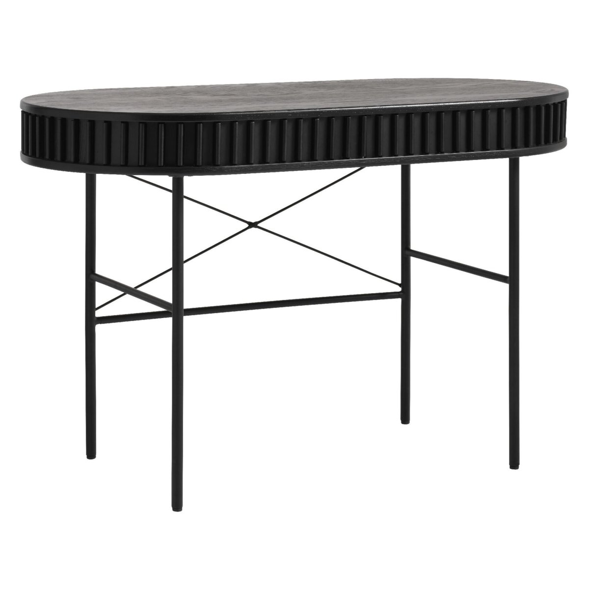 Dit elegante ovale bureau geeft je werkplek een moderne, lichte en ruimtelijke uitstraling. Dankzij het compacte formaat past het perfect in de thuiswerkplek, studeerkamer, slaapkamer of woonkamer. Met een lengte van 120 cm, breedte van 60 cm en hoogte van 75 cm creëer je een volwaardige en ergonomische werkplek, zonder dat het bureau je kamer domineert. Het ovale bureaublad van eikenhout met eikenfineer op MDF oogt warm en luxueus, terwijl de vier zwarte metalen poten zorgen voor een stabiele basis. De zwarte kleur met subtiele glans sluit naadloos aan bij industriële, moderne en Scandinavische interieurs. Ideaal als computertafel, schrijftafel, studietafel of compacte home office werkplek.