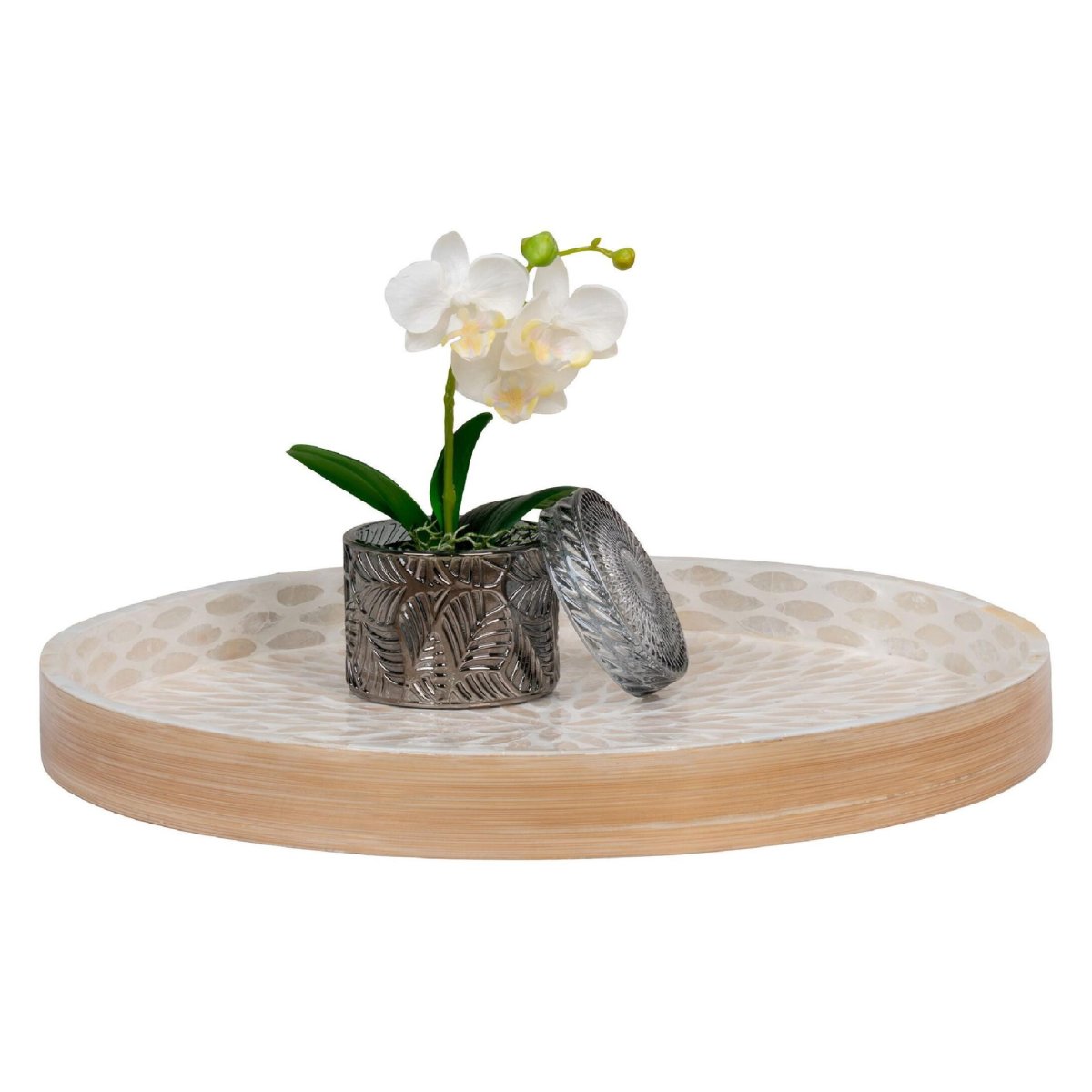 De combinatie van bamboe, MDF en capiz geeft dit dienblad een hoogwaardige, natuurlijke en toch moderne uitstraling. Bamboe is licht van gewicht, sterk en heeft een warme, natuurlijke nerftekening. MDF zorgt voor een strakke vorm en een solide, vormvaste basis. De capiz inleg zorgt voor een subtiele parelmoerachtige glans die prachtig meebeweegt met daglicht en sfeerlicht. Daardoor oogt het plateau elegant, chic en rustig tegelijk, zonder te schreeuwerig te worden.