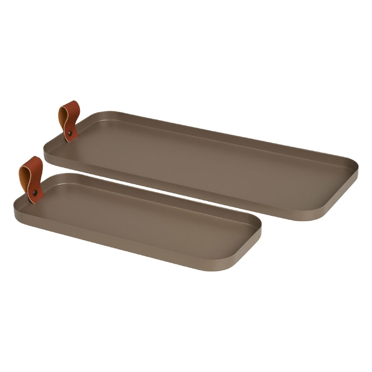 Dankzij de combinatie van 29 x 12 cm en 39,5 x 16,5 cm heb je altijd het juiste formaat dienblad bij de hand. Gebruik het kleine metalen tray voor espresso, theeglazen, kruidenpotjes, oliën, sieraden of badkamerbenodigdheden; het grotere dienblad is ideaal voor een compleet ontbijt, borrelplank, geurkaarsen, vazen of een decoratieve set met woonaccessoires. De lage rand maakt het mogelijk de bladen makkelijk in een open kast, lade, vensterbank of op een smalle sidetable te schuiven. Zo bundel en orden je kleine spullen zonder dat het rommelig oogt, en creëer je visuele rust op aanrecht, dressoir, bijzettafel of bureau. Ook zeer geschikt als basis voor seizoensdecoratie, feestelijke tafelschikking of als stijlvolle organizer op kantoor.