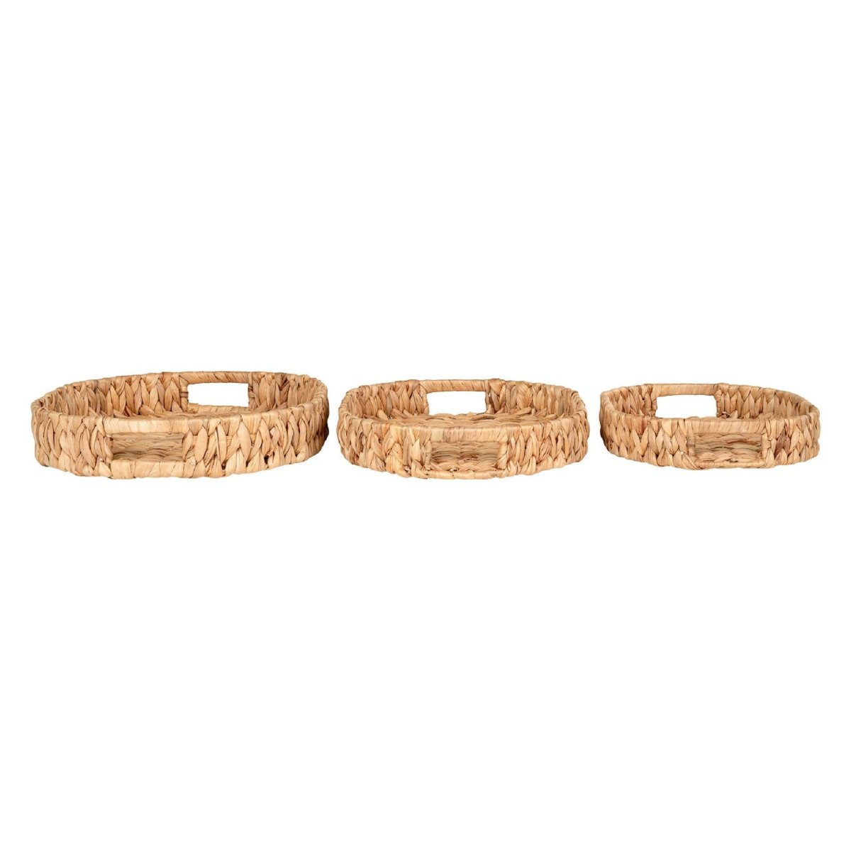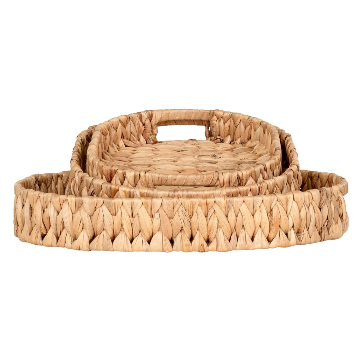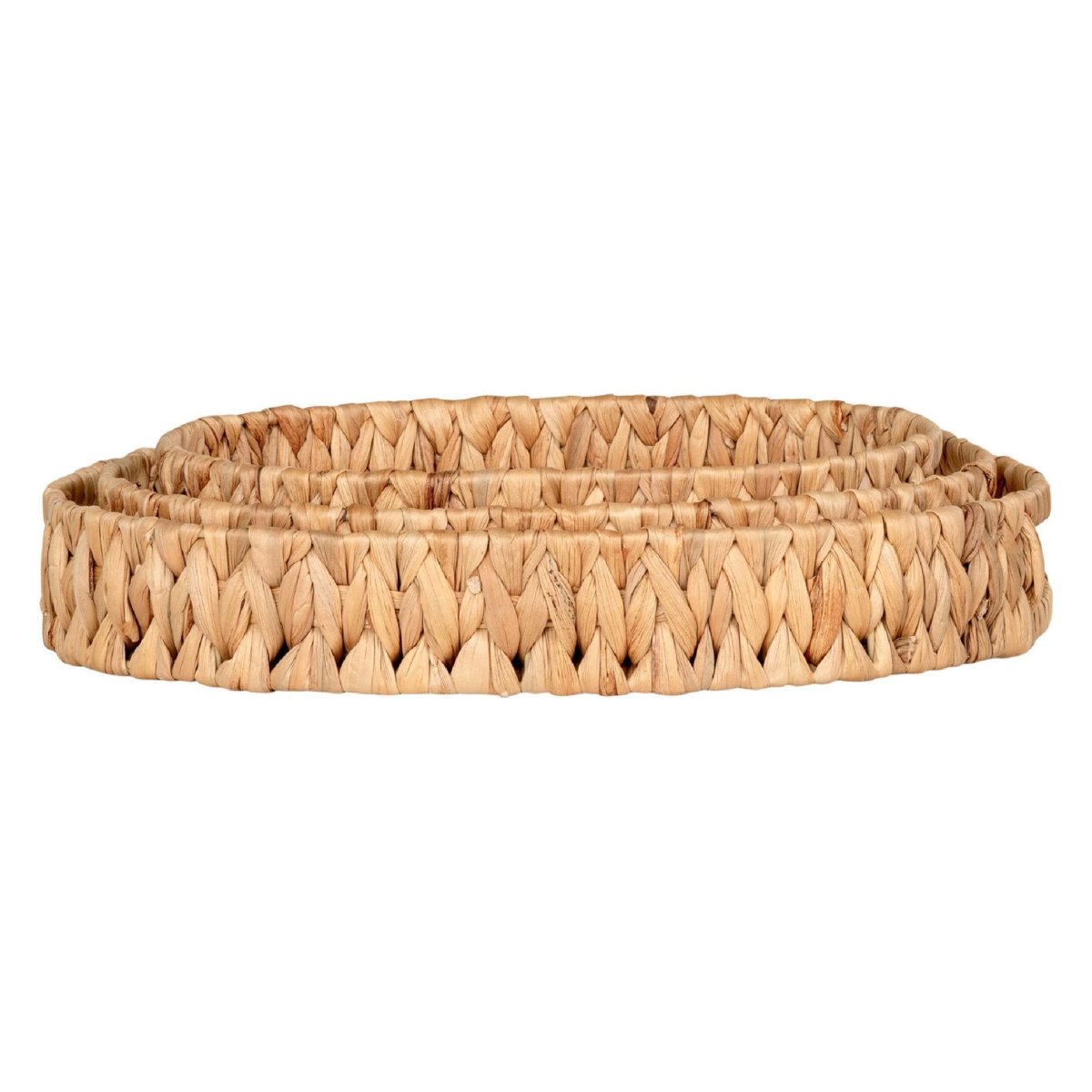 De gevlochten structuur in waterhyacint-stijl geeft deze jute dienbladen een rustgevende, natuurlijke look die direct sfeer en warmte toevoegt aan je interieur. Het neutrale beige combineert mooi met hout, linnen, keramiek en glas, waardoor je de trays gemakkelijk afstemt op bestaand servies en woonaccessoires. Gebruik het grootste dienblad als decoratief plateau op de salontafel met kaarsen en een vaasje, zet het middelste serveerblad in de keuken met olie, kruiden en peper- en zoutmolens, en leg het kleinste dienblaadje op je nachtkastje voor sieraden, parfum of dagelijkse essentials. De opstaande randen zorgen voor extra stabiliteit, terwijl de open weving een lichte, luchtige uitstraling behoudt. Zo creëer je in elke ruimte direct een opgeruimd, stijlvol en natuurlijk geheel.