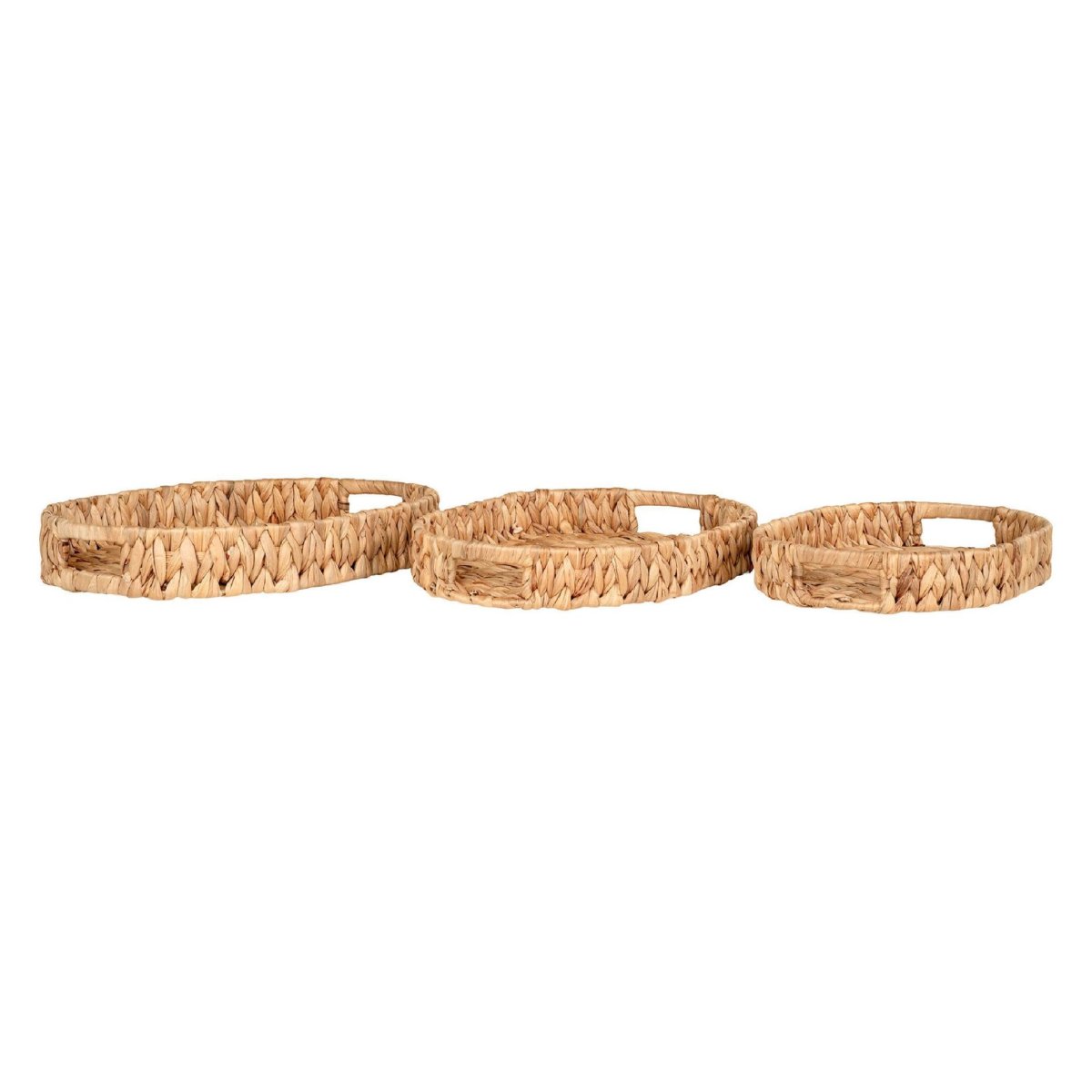 Geef je woonkamer, keuken of eettafel een kalme, natuurlijke uitstraling met deze stijlvolle set dienbladen in waterhyacint-look. Je ontvangt drie beige trays van jute met een warme, gevlochten textuur die perfect aansluit bij bohemian, Scandinavische en landelijke interieurs. Gebruik ze als serveerblad voor koffie, thee en hapjes, of als decoratief plateau voor kaarsen, vaasjes, verzorgingsproducten of badkamerspullen. Dankzij de drie verschillende formaten style je eenvoudig per seizoen, terwijl de opstaande randen alles veilig op zijn plek houden. De dienbladen zijn licht, stevig en multifunctioneel, zodat je moeiteloos schakelt tussen serveren, organiseren en decoreren.